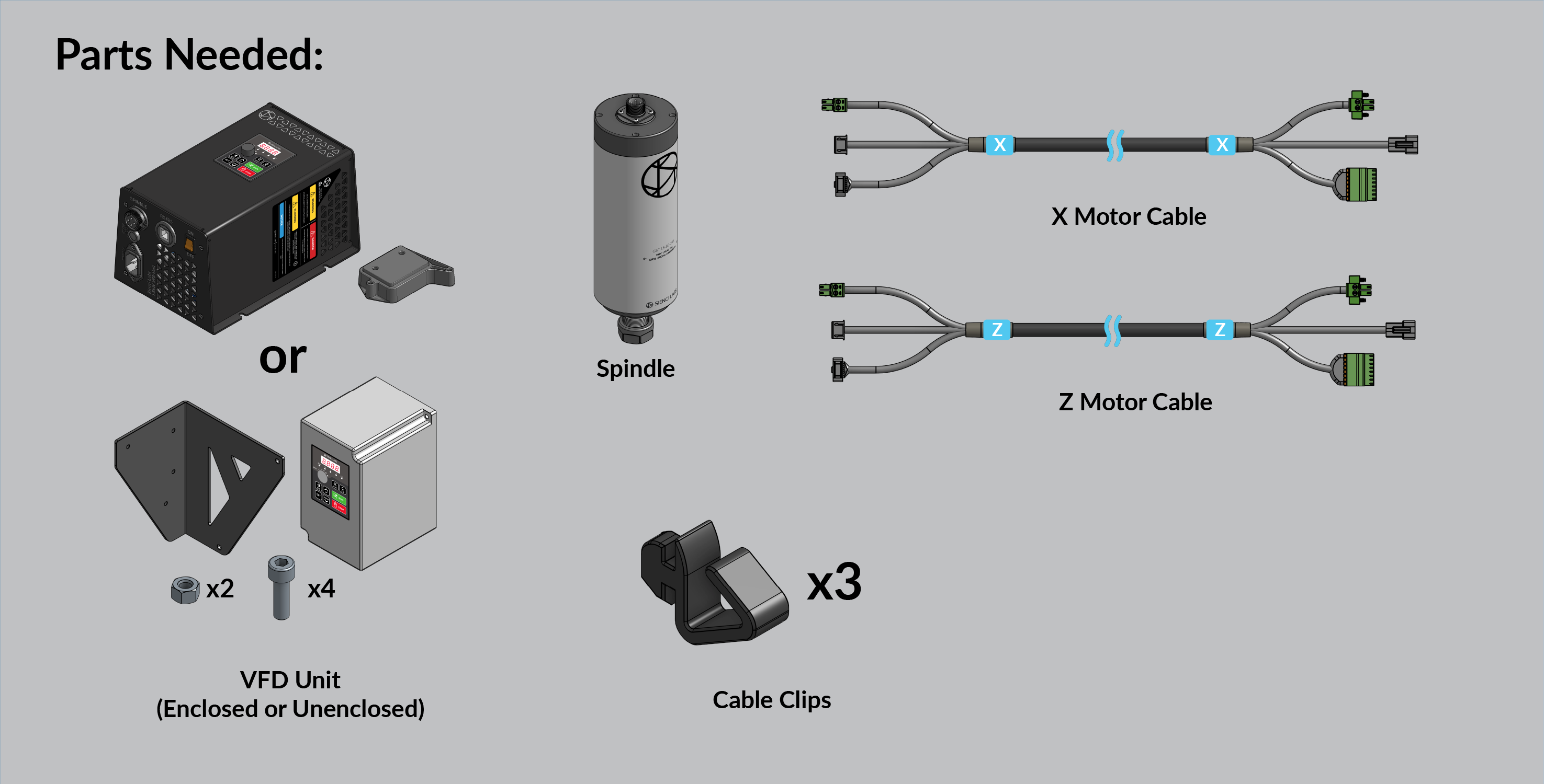 If you purchased the Sienci Labs Spindle Kit, please use either the Enclosed VFD (no VFD mounting bracket) or Unenclosed VFD (with VFD mounting bracket) instructions.