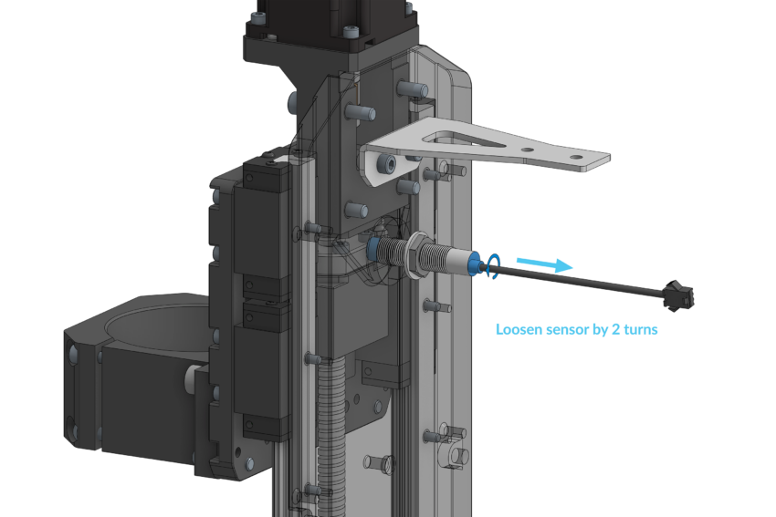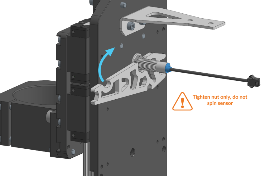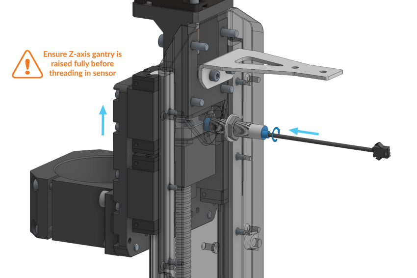 Slide the Z-axis gantry up to its highest position until it can’t move further. Thread the inductive sensor loosely through the back of the Z-axis assembly until the sensor bottoms out and locates inside the plate, do not tighten this further.