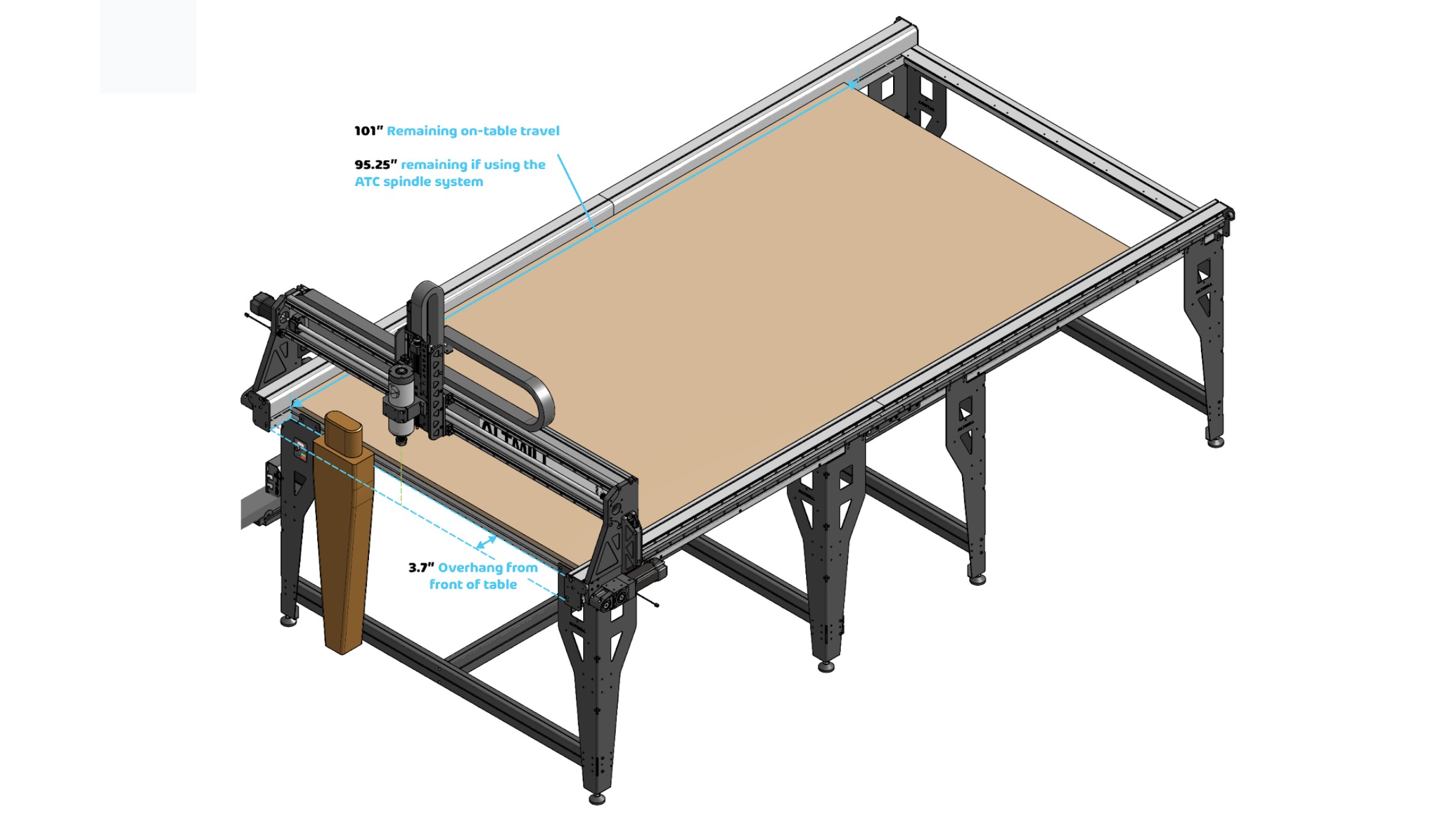 - You will still have 101″of remaining on-table spindle travel, allowing you to load full 4’x8′ sheet goods.