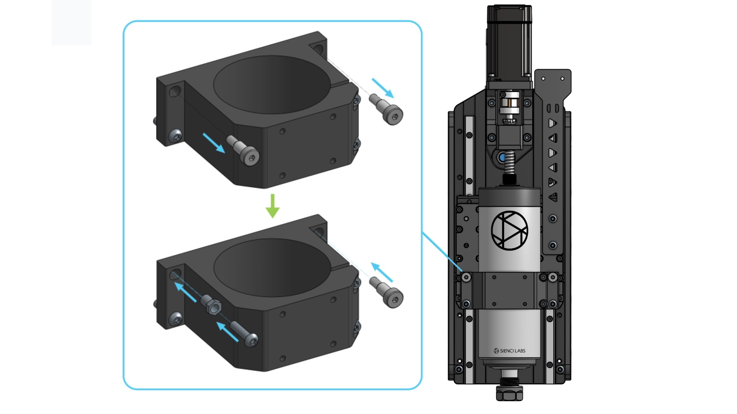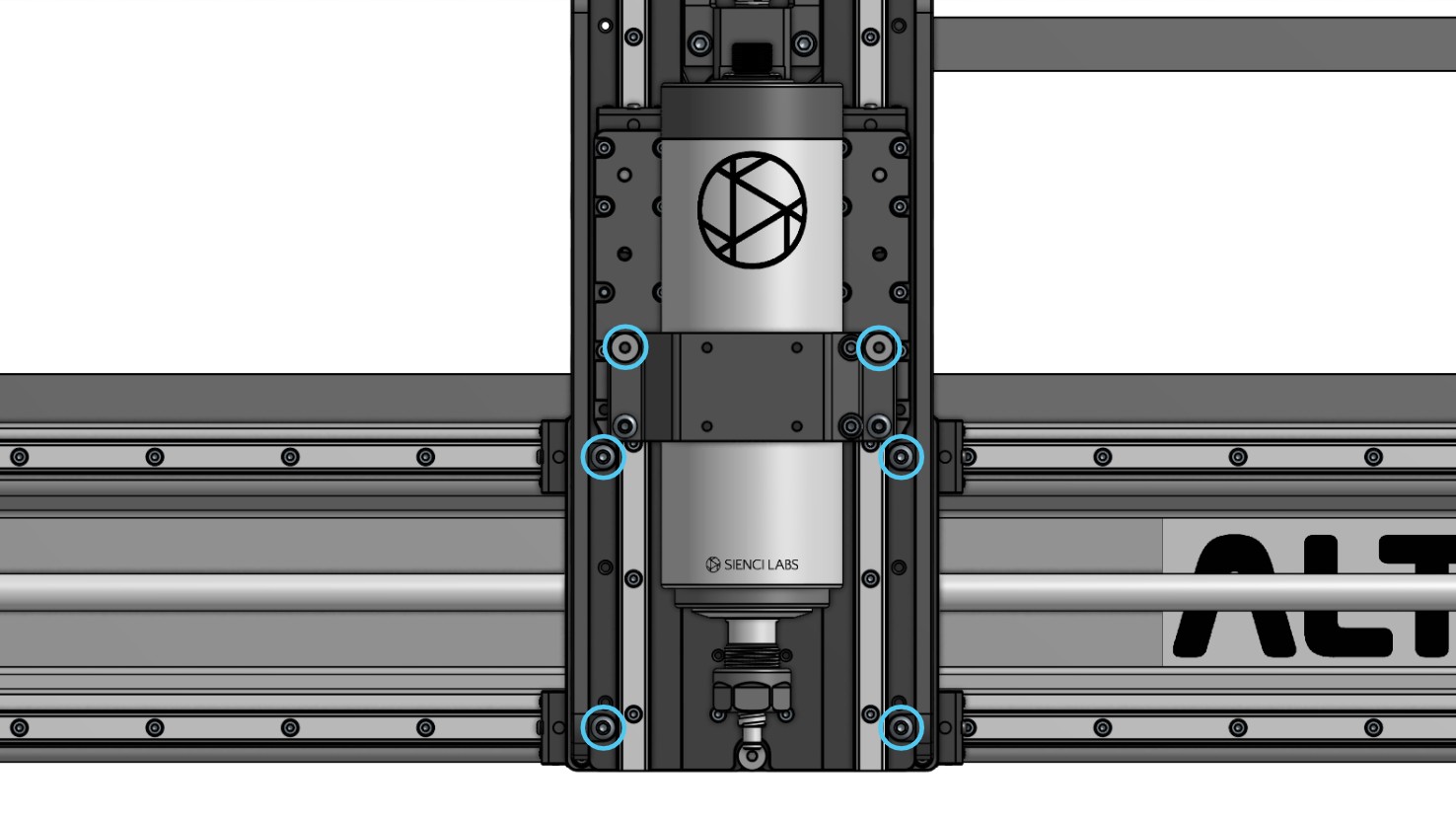 1. Swap the left shoulder screw, to use the ‘Eccentric Bushing’ and an extra M6-25mm button head cap screw inside this hole instead. Slightly loosen all four screws securing the spindle mount to allow the mount to pivot.