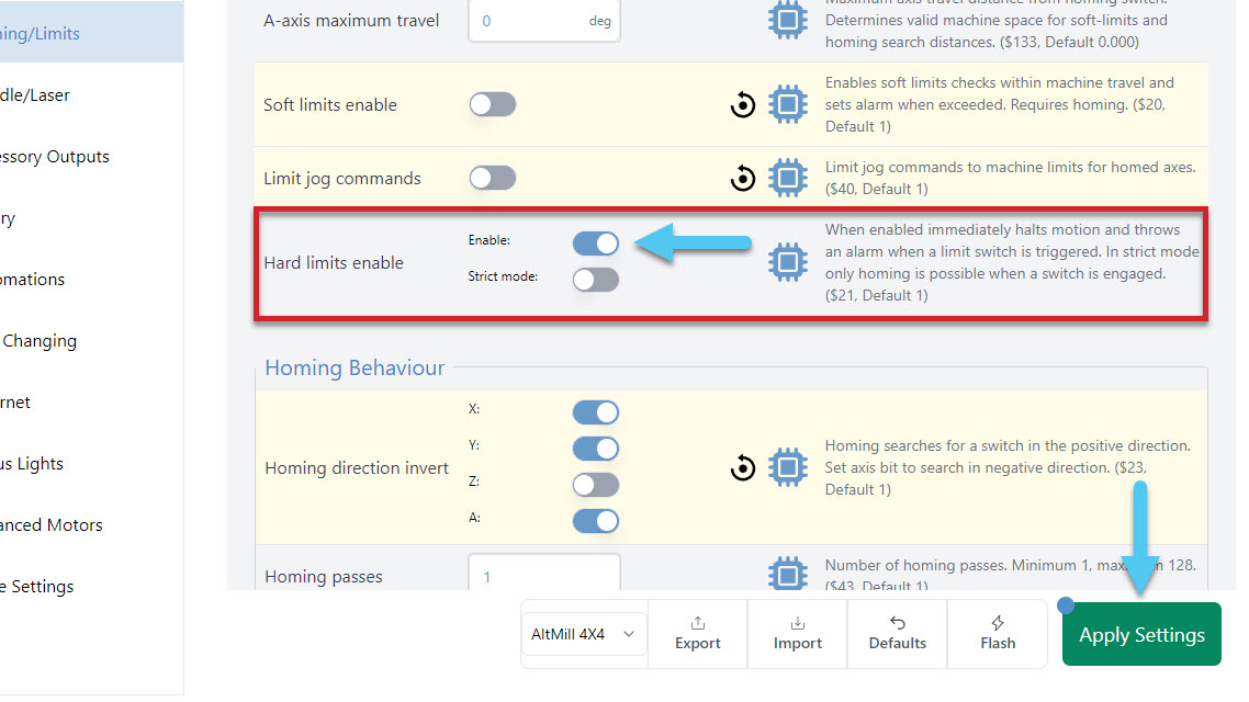With hard limits on, if your machine get’s close to the edge of an axis, your limit switch will trigger, stopping any further movement. To enable hard limits, Config ➜ Homing/Limits ➜ Hard limits enable ➜ toggle on. Don’t forget to hit the Apply Settings button to save!