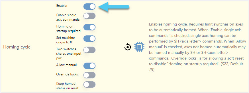 When we turn on homing, we can use 3 or more limit switches to find our machine coordinate home on our machine. For now, we will home to the front left corner of the machine. To enable Homing, Go to Config ➜ Homing/Limits ➜ Homing cycle enable ➜ toggle on.