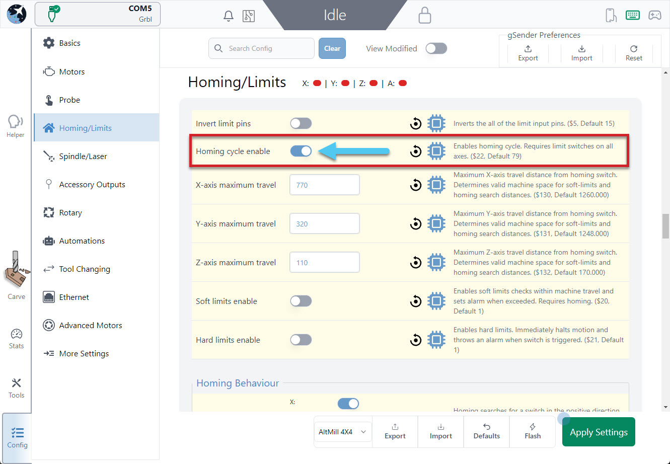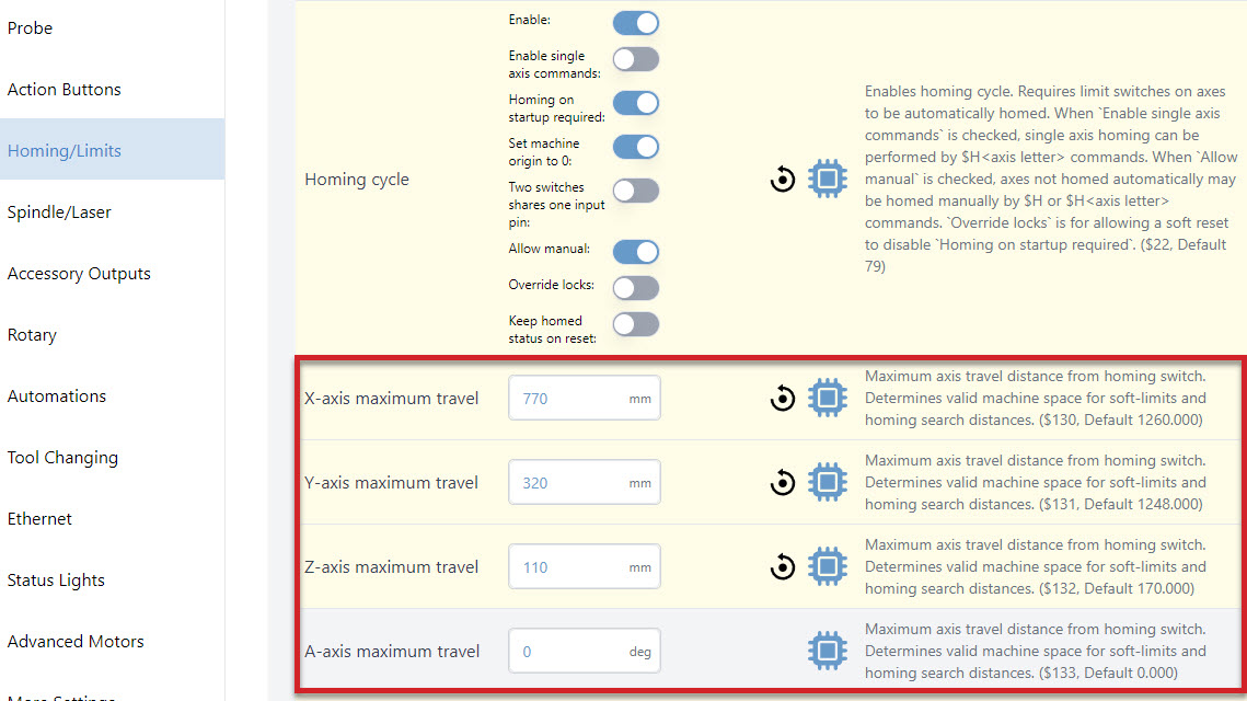 If you’re having issues with the “quick-travel” buttons, then check the maximum travel settings for your machine to see if they are the same as what your machine is physically capable of moving. You can find these settings by going to Config tab ➜ Homing/Limits ➜ X-axis maximum travel (Y, Z axes are here too), $130-$132. If you are using grblHAL you will also see A axis, $133.