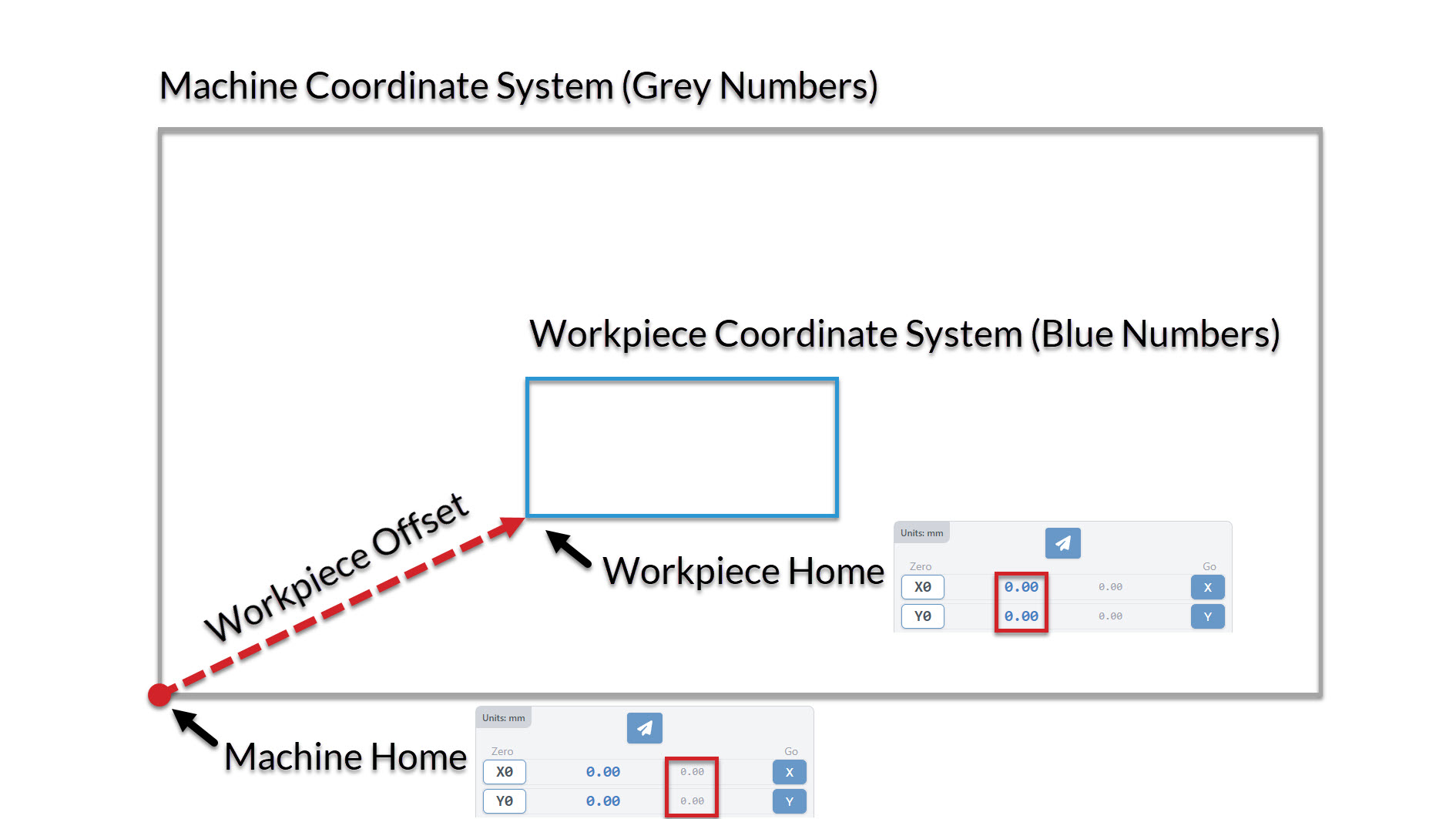 The workpiece offset is a user-defined coordinate system that aligns the machine’s operations with the specific location of the workpiece on the machine bed. This system allows users to set a new origin point (0,0,0) based on the workpiece’s position.​ This is indicated by the blue numbers in the DRO.