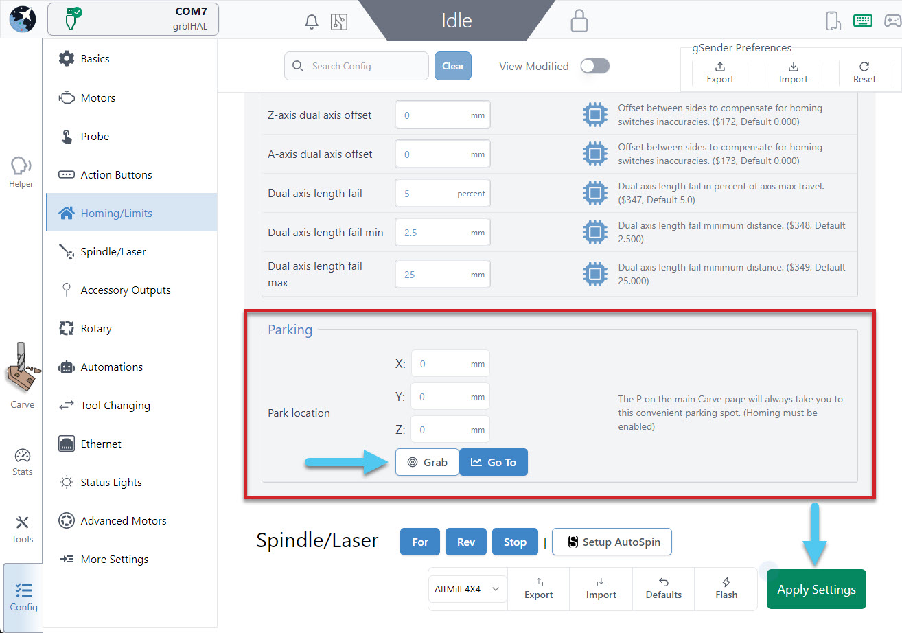 You can configure a Park Location to move your router to a set spot consistently at the click of a button. To setup your parking spot, Go to Config ➜ Homing/Limits and scroll down to the bottom of the section. Here you can enter the coordinates of your parking spot manually, or move your router/spindle to the spot you wish to park and hit the Grab current position button. Test out your new spot by hitting the Go to button in settings or hitting the P button on the DRO. Don’t forget to hit the Apply Settings button to save your new spot!