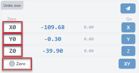 1. Zero each axis one at a time using ‘X0’, ‘Y0’, and ‘Z0’ buttons