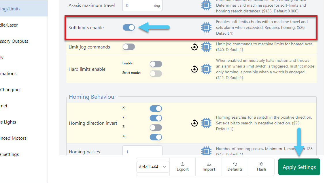 With 3 limit switches in place, and homing turned on, we can turn on soft limits. This feature will combine your 3 limit switch homing cycle with your maximum travel lengths, to prevent you from going too far on each axis. Think of this as a software limit, we use 3 limit switches + your max travel to calculate your soft limits. To enable soft limits, Config ➜ Homing/Limits ➜ Soft limits enable ➜ toggle on. Don’t forget to hit the Apply Settings button to save!