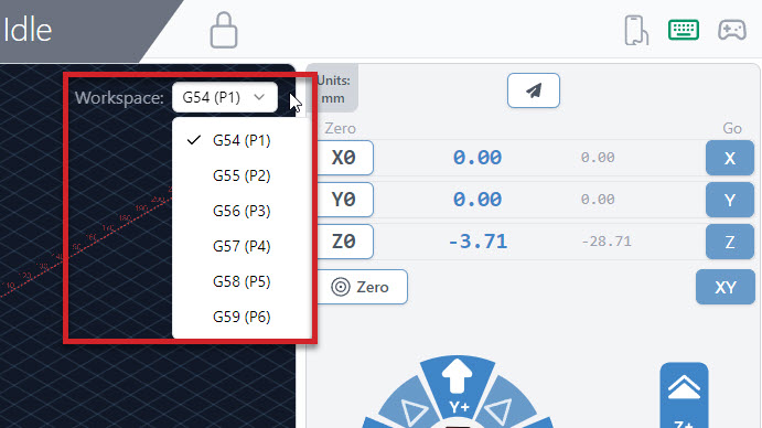 Usually you would only have one origin or zero position for your project. However, if you plan to do a series of projects that require different zero positions, or are lining up to do some more complex jigging or part batches, you may want to set up multiple workspaces all at once. This can save you time by not having to set a zero position for repetitive tasks or specific jig setups. You can do this by creating up to six different zero positions with the six workspaces in gSender. Access each ‘Workspace’ at the top right of the program by pressing the drop down to select which workspace to use. gSender will act completely in-line with whatever workspace you’ve selected, whether you want to set zero, probe, surface, or anything else.