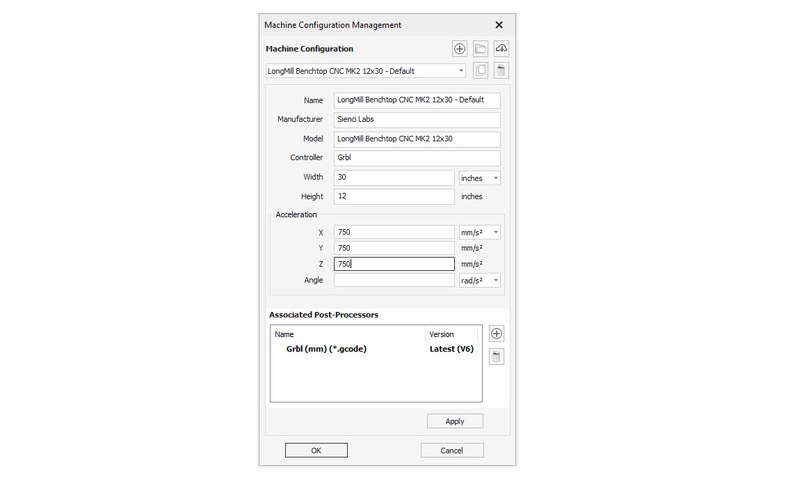 Please refer to the image below to fill out the configuration. For the latest version of VCarve, please input all the LongMill accelerations as 750mm/s² and AltMill accelerations as 1500 mm/s². If not using these CNC’s, consult your manufacturer for your recommended motor speeds.