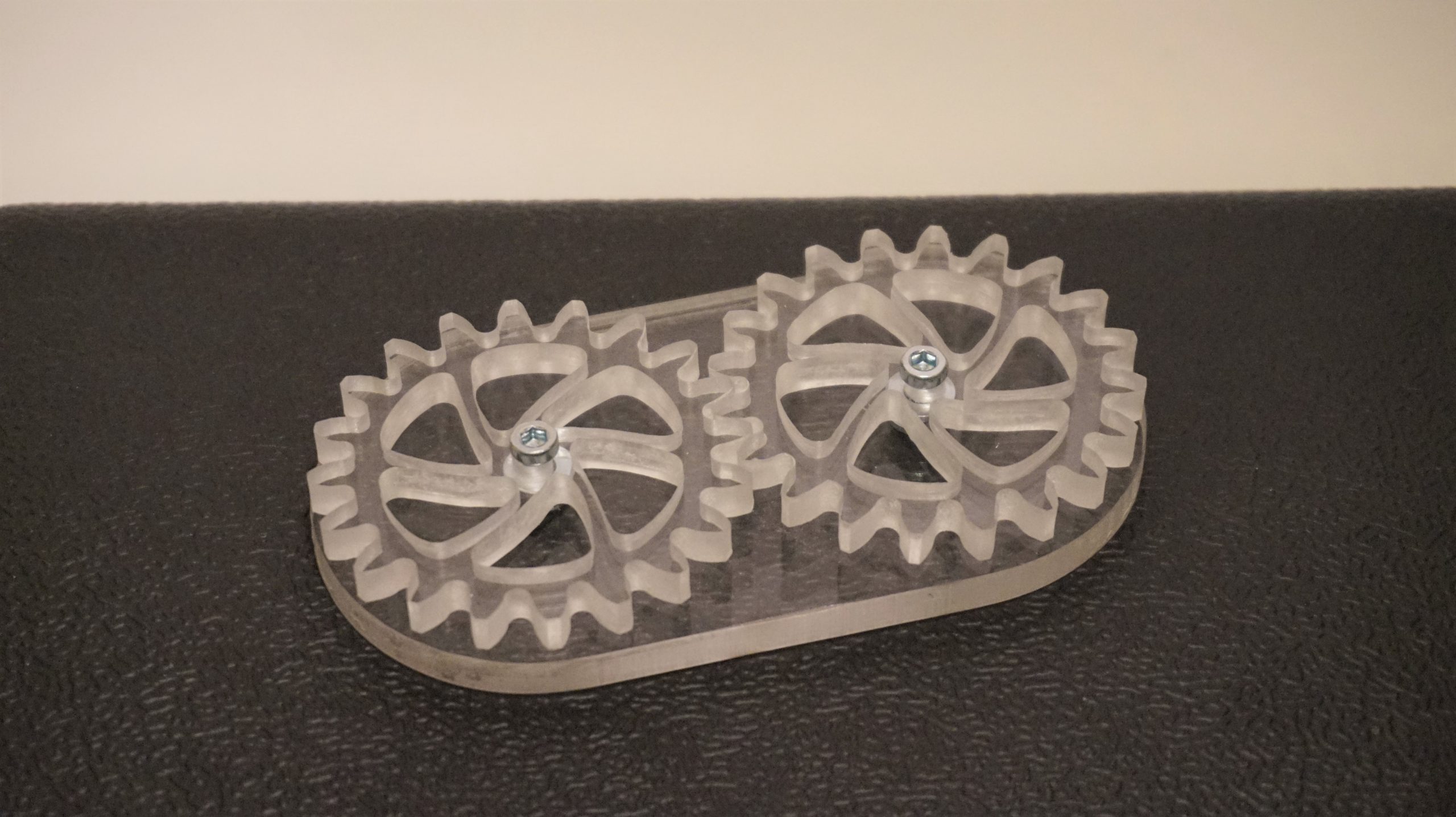 This gear train was designed from scratch by Chris. If cut properly, minimal drilling should be required to use two M4 bolts and washers (or 8-32) and thread them into the gear train base.