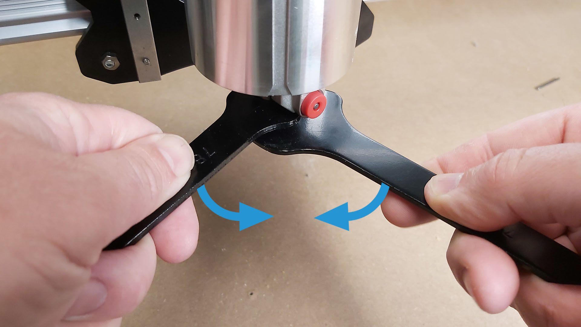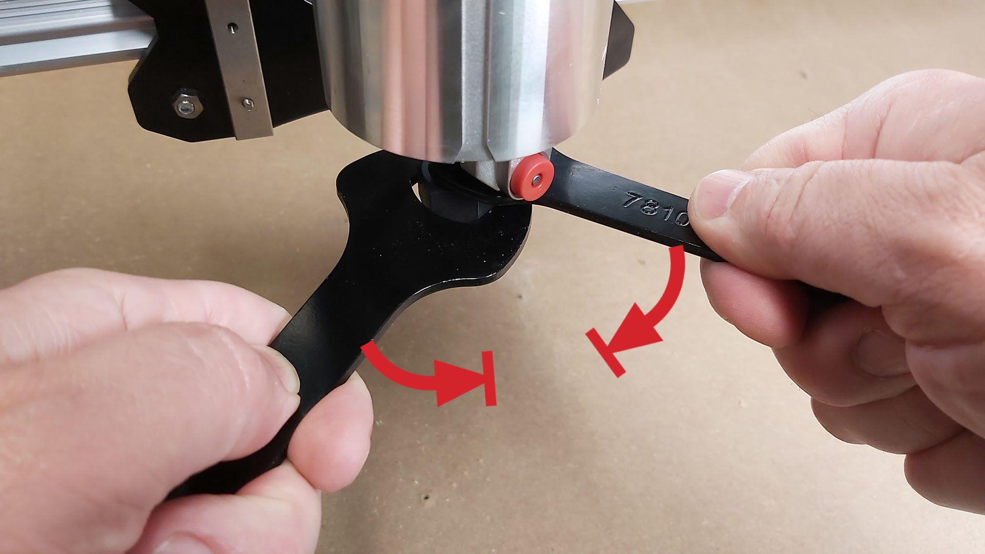 To tighten the collet nut, place the small wrench on the right side of the router shaft. Place the large wrench on the collet nut on the left side. Squeeze together until the nut is tight, do not over tighten.