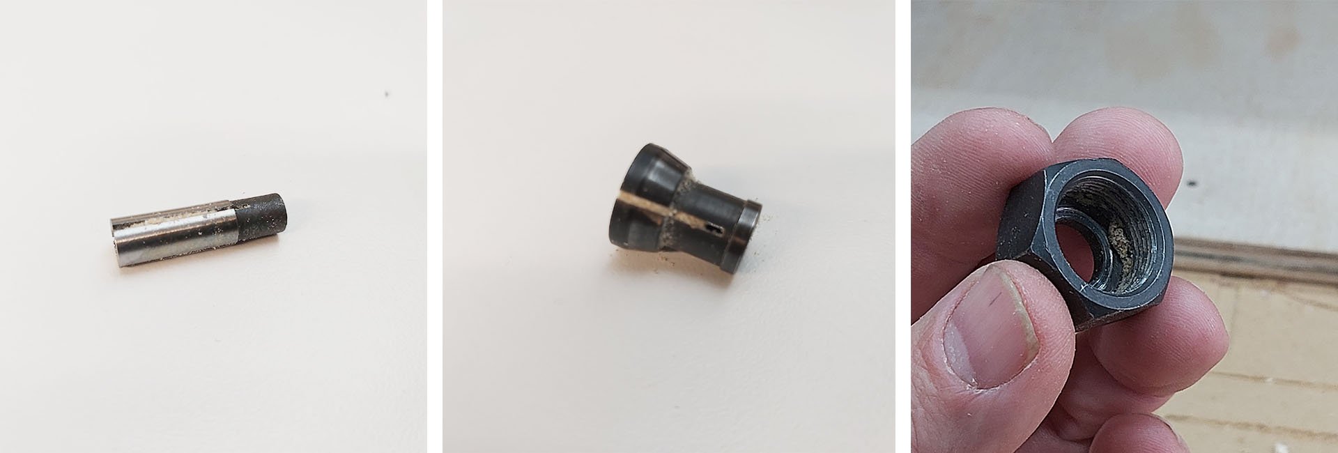 Always make sure the collet, the adapter, and the nut are free from debris before running. Dust buildup will prevent the collet from being tightened correctly and can ruin a workpiece. Dust can build in the inside corners of the nut and will prevent proper tension. Clean with a small tool or compressed air.