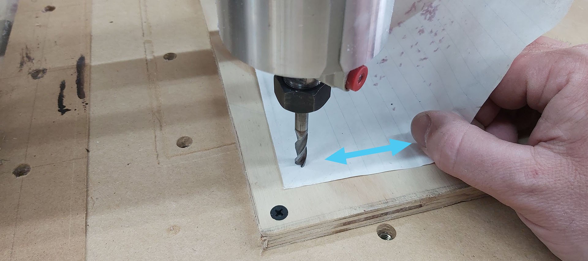 Lower the bit to the material by jogging the Z-axis down. When you are just above the surface, change to precise jogging. Place a piece of paper under the bit. Move the paper back and forth and at the same time, lower the bit. When there is resistance sliding the paper, the bit is at the correct position. Zero the Z location in the software. Raise the bit, go to your X and Y starting positions and you’re ready to begin.