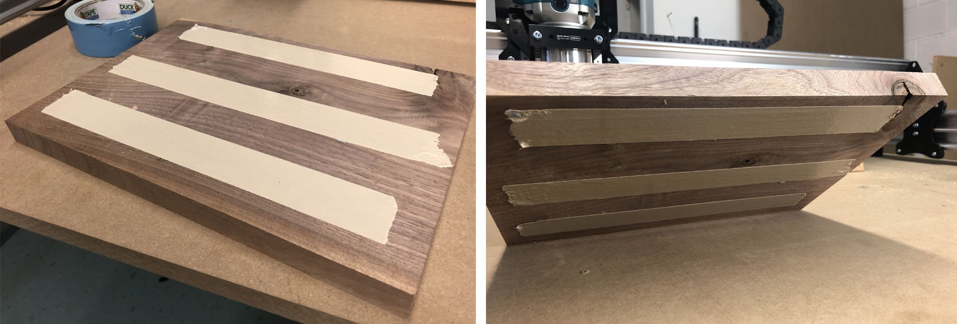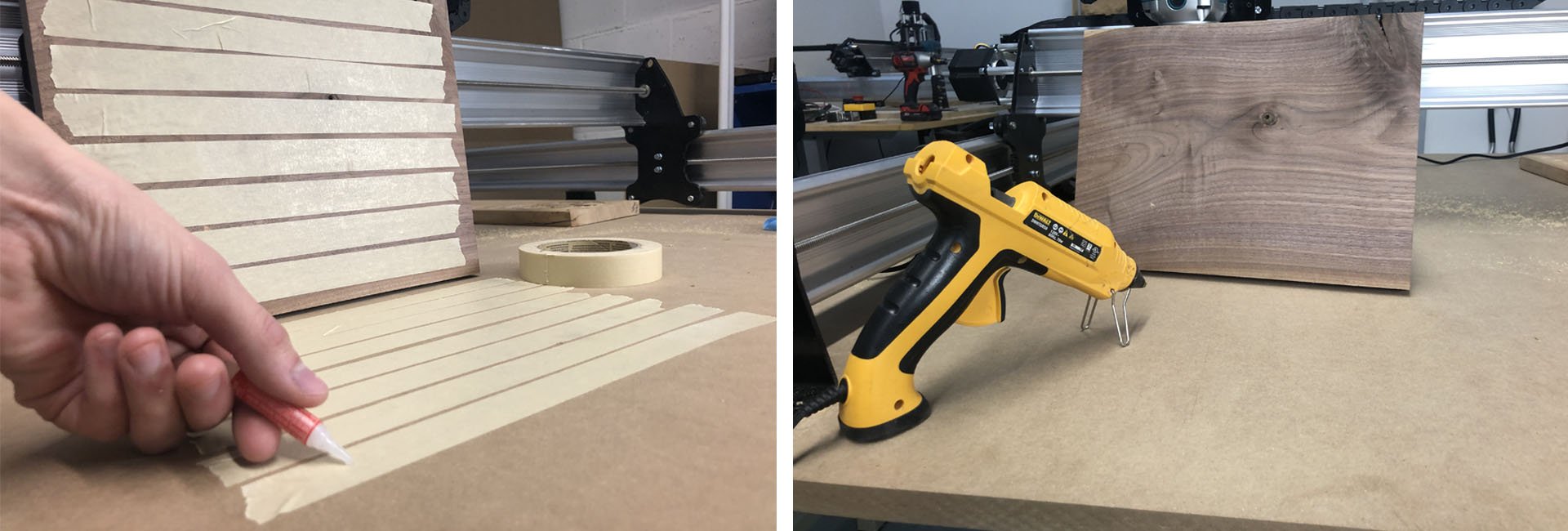 Tape is applied to the back of the workpiece and to the top of the work surface. Apply fast-acting glue to the work surface and place the workpiece on top with pressure until set. Once finished, remove the tape. Hot gluing your material to the table is also an effective way to hold the piece down when doing light machining.