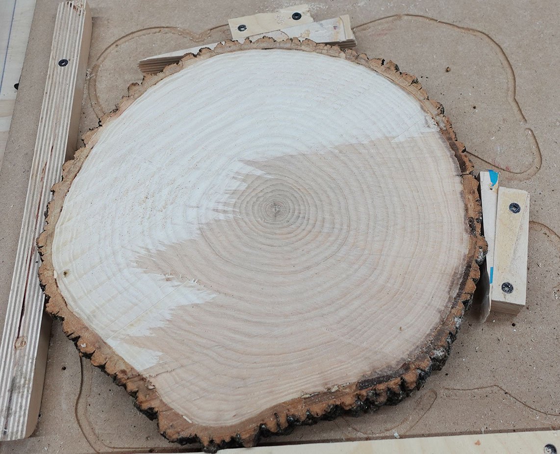 Clamping material to the work surface is necessary for a successful part. Clamping methods are determined by the design and material you are using. Below are common examples of clamping methods. Small items could be held in a vice with some care. Clamps can be made out of metal, plastic, or wood.