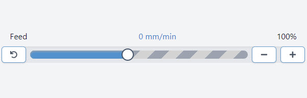 When a job has been started, gSender will show a feed adjustment control panel beside the machining time. Clicking on the plus or minus button will adjust the feed rate faster and slower, or simply use the slider itself.