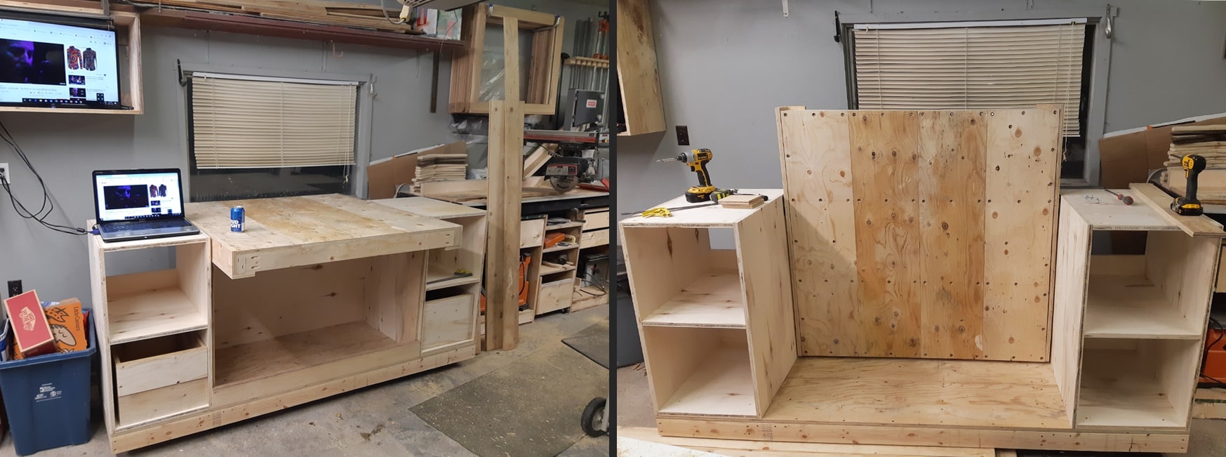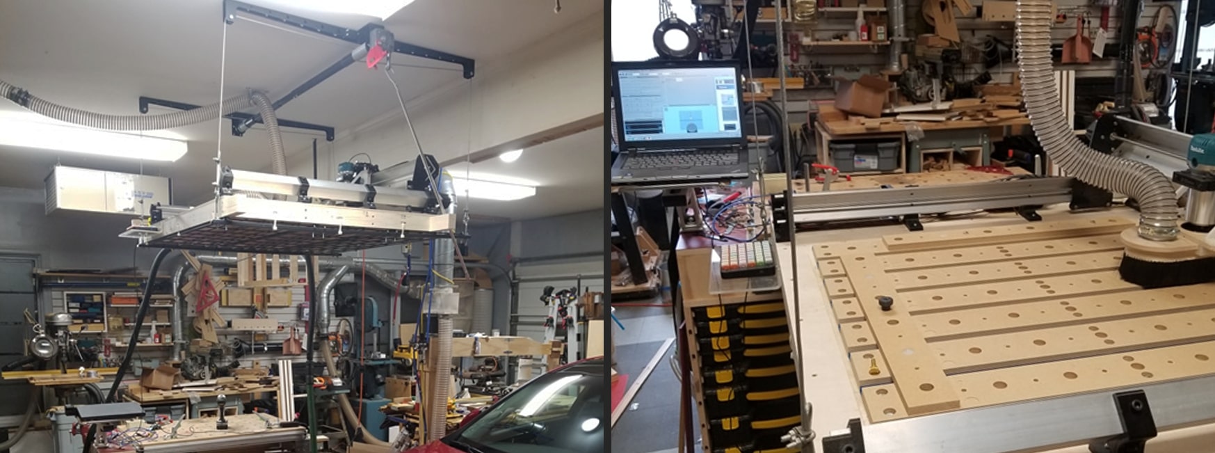 Another great concept for space saving came from Philip, who managed to claim the ‘air rights’ in his two-car garage so that he could hoist his CNC out of the way when not in use. When lowered, the shelf clamps onto his rolling workbench to give it the necessary stability while cutting:
