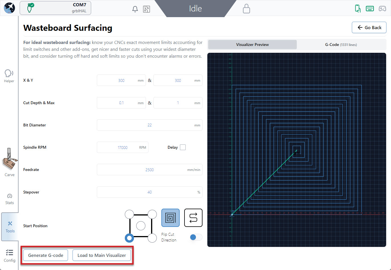 We also have a ‘Surfacing’ utility built into gSender that you can use for g-code generation with much less fuss. Once you decide on your settings you can ‘Generate G-code’ to view the path and then ‘Run on Main Visualizer’ to import the g-code to run it just like a regular g-code file.