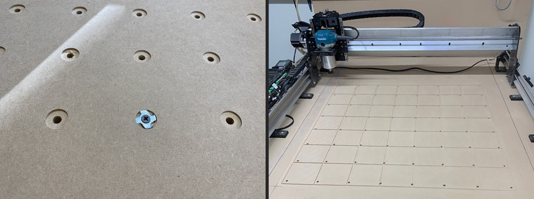 A cheap and straight forward mounting concept, shown off on our forums by both Mike and Frank. By starting with a simple sheet of MDF and running a drilling and boring operation on that sheet using a CNC, threaded inserts can be hammered into the sheet to form a mounting hole pattern for clamps and jigs which can be placed repeatably: