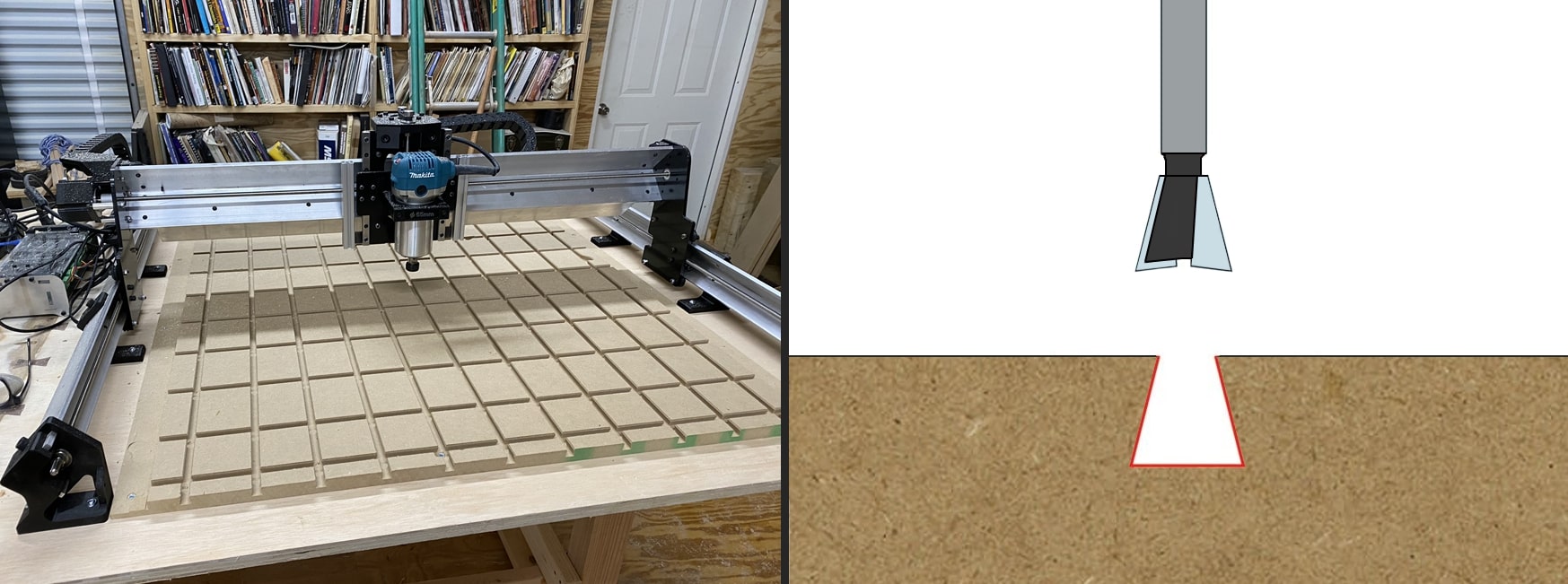 Dean took a similar approach to the threaded-insert setup by starting with a simple sheet of MDF, however he used a dovetail cutting bit to create a dovetail profile in the board in a cross-hatching design instead. This enables him to use special dovetail nuts as free-moving mounting points for his clamping hardware: