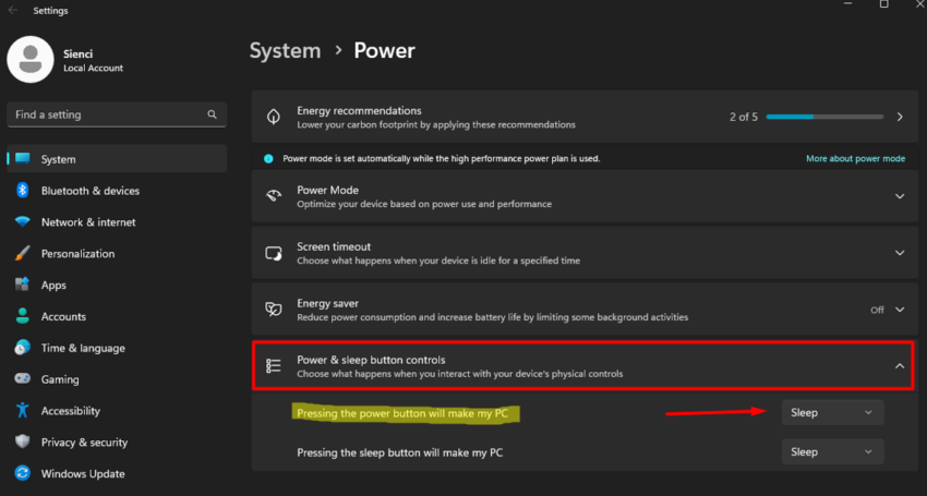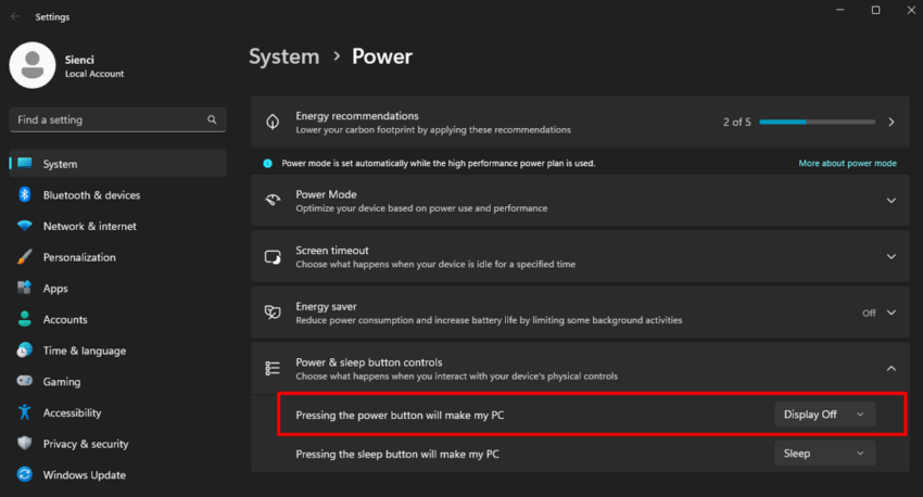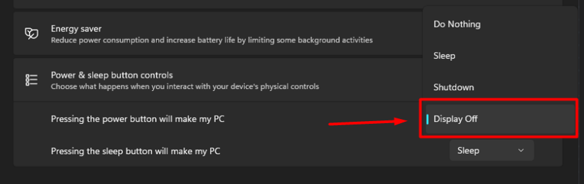 Find the option “Pressing the power button will make my PC” and change it from Sleep to Display off.
