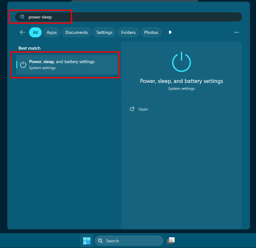 Step 1: Click the Search bar and type “power sleep”. In the results, you’ll see Power, sleep, and battery settings. Click it to open.