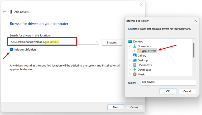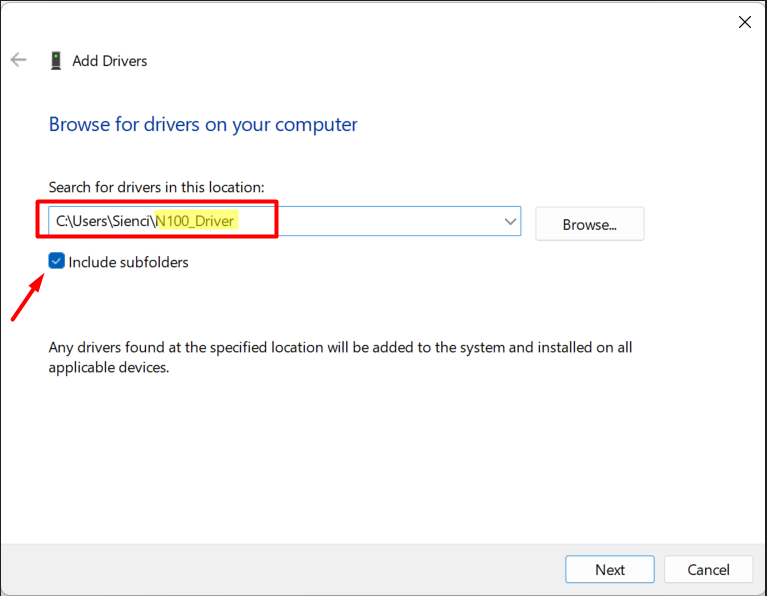 If you see the path C:\Users\Sienci\N100_Driver in the search bar, simply click Next, and Windows will automatically install the drivers. If the path doesn’t appear, click Browse, locate the extracted gcp-drivers folder in your Downloads, select it, and click Next.