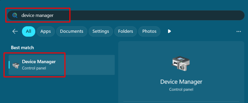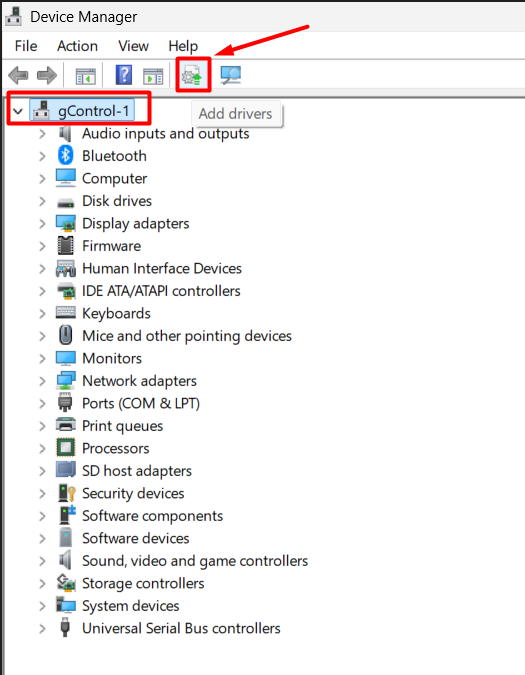 Next, open Device Manager by typing it in the search bar and selecting it. Click on your device name (for example, gControl-1), and then click the “Add drivers” icon.
