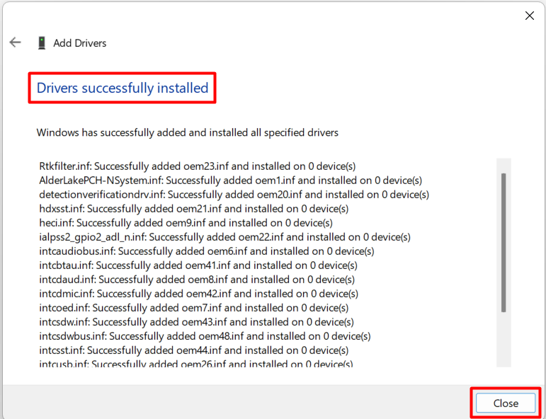 The command prompt will add the driver packages. Wait until you see the message “Driver installation completed.“. Then, press any key to close the window.