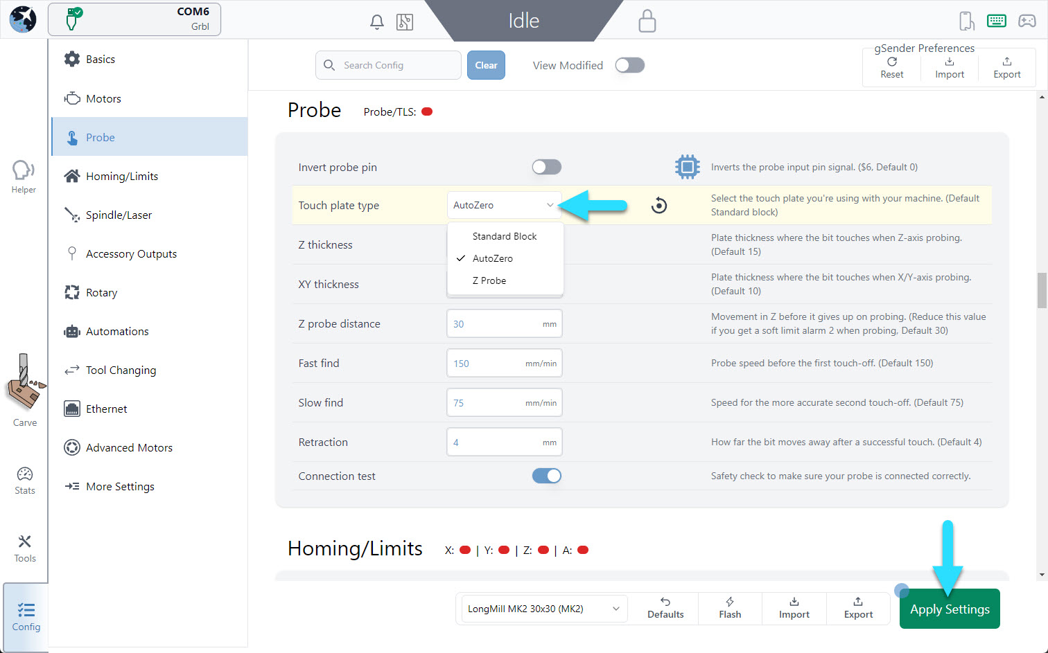 The key step is to make sure to go to gSenders settings (Config tab in the bottom left) ➜ go to the ‘Probe’ settings ➜ and change the touch plate type to “AutoZero Touch plate” in the dropdown menu. If you don’t do this, or at a later time you find the probing macros are moving strangely, then you should come back to check that this setting is still correct. Remember to hit the Apply Settings button once you’ve changed your touch plate type.