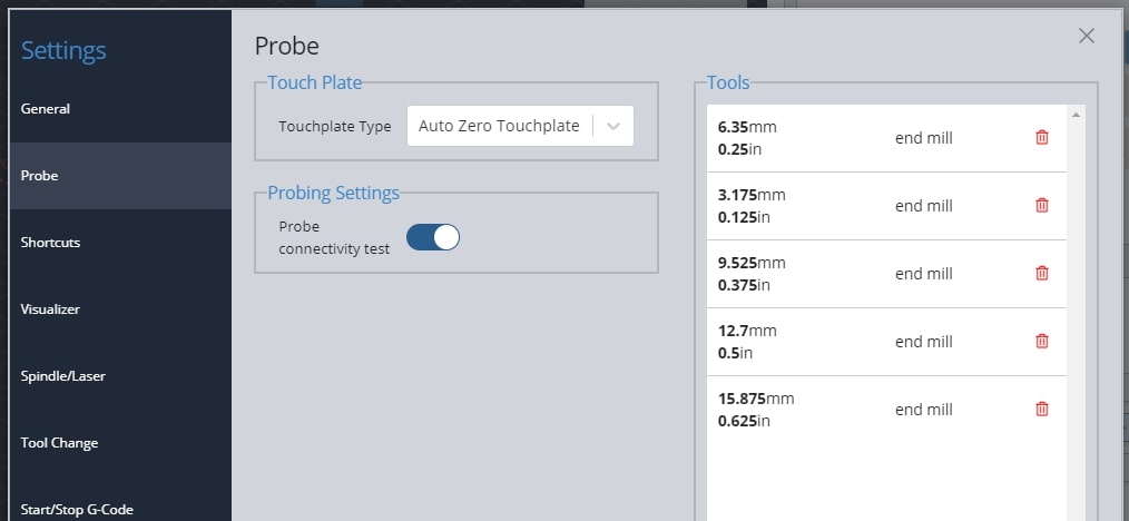 gSender comes pre-loaded with all the settings needed for our touch plate and is able probe easily in the X, Y, and Z-axis and some other combinations.