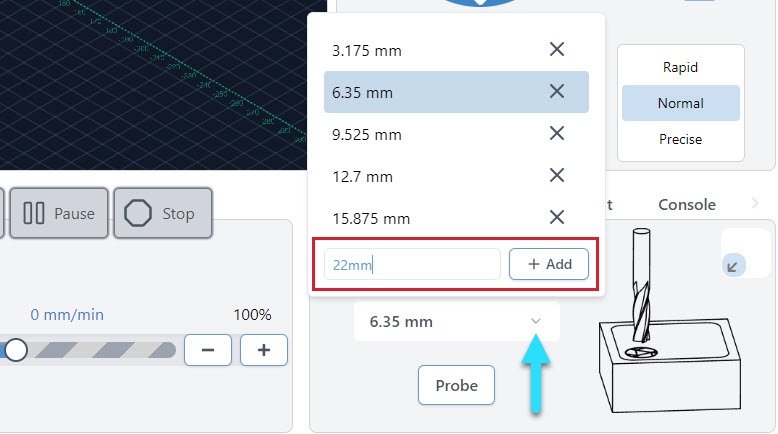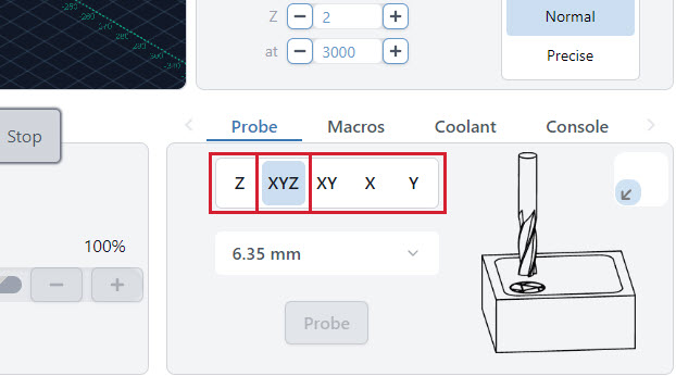 All probing happens in the Probe tab in the main window. Here you can select what type of probing you’d like to perform as well as select the tool you’ll be using or you can type in the tool size manually.