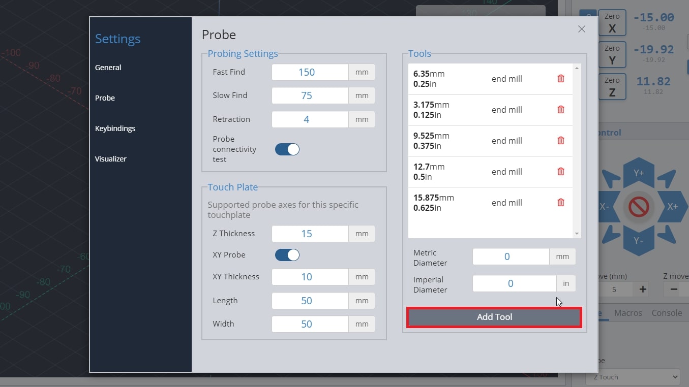 If you have a third-party touch plate, you can press the gear icon at the top right of the window to access the settings, which will pop up a window. Go to the ‘Probe’ settings on the left hand side. Here you’ll be able to customize your plate dimensions, the probing speed, or switch over to a Z-only probe.