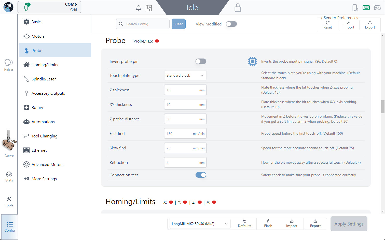 We recommend leaving the “Probe Connectivity Test” option activated as well. If you’re not using gSender and have the AutoZero, we also provide macros for other common senders.