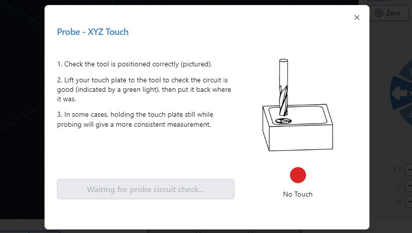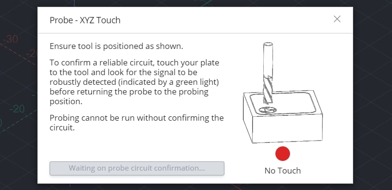 Back in the ‘Probe’ tab, you can choose which axis to probe for and the diameter of the bit you’re using – in this case select ‘XYZ’. The bit size can be selected from the drop-down of saved bits, or can be typed in manually. Press the ‘Probe’ button and you’ll get a pop-up window to confirm you’ve positioned your bit correctly and you’ll be prompted to check for a good connection.