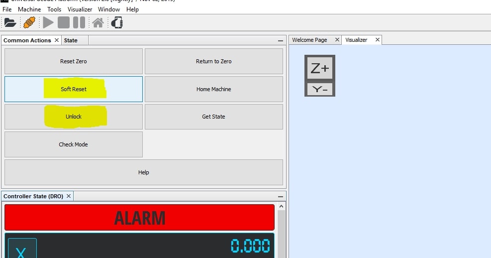 If the probing was unsuccessful, then it’ll be indicated by the cutting bit not returning to where you started the probe cycle or the machine will be put into an ‘ALARM’ state. To bring it out of the alarm state, press the pulsing ‘Unlock’ button in the middle of the visualizer and that will put the machine back into its ‘IDLE’ state. An unsuccessful probing cycle can result from an incorrectly positioned probe or starting too far outside the circular logo. Be sure to verify your setup before attempting another probing cycle.