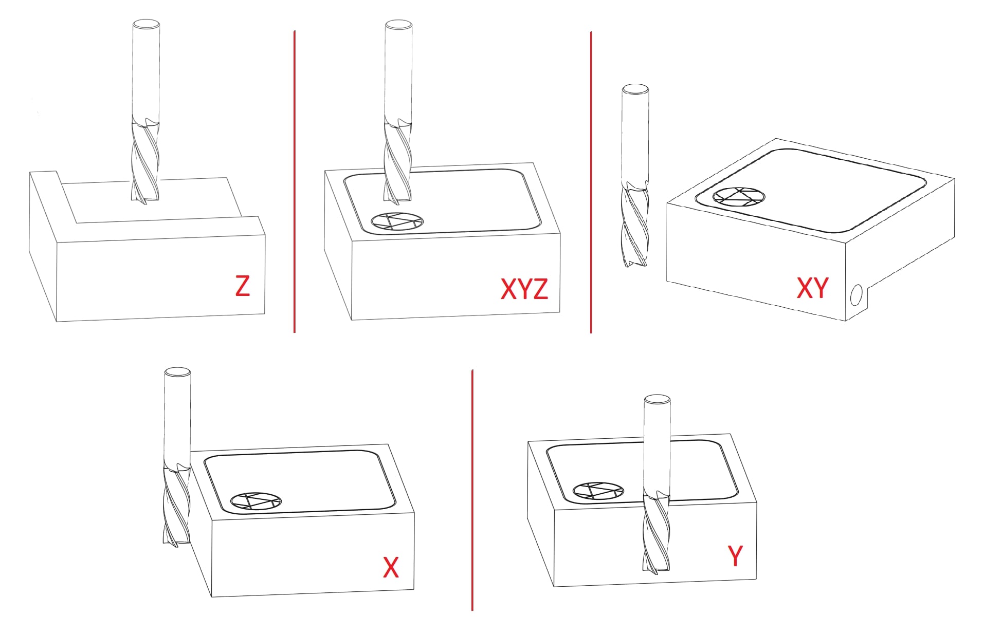 The AutoZero can probe in all three axes. The type of probing can be selected with one of the five options on the interface. The selection determines which axis the machine will be probing for and which coordinates it will reset once the probing cycle is complete.