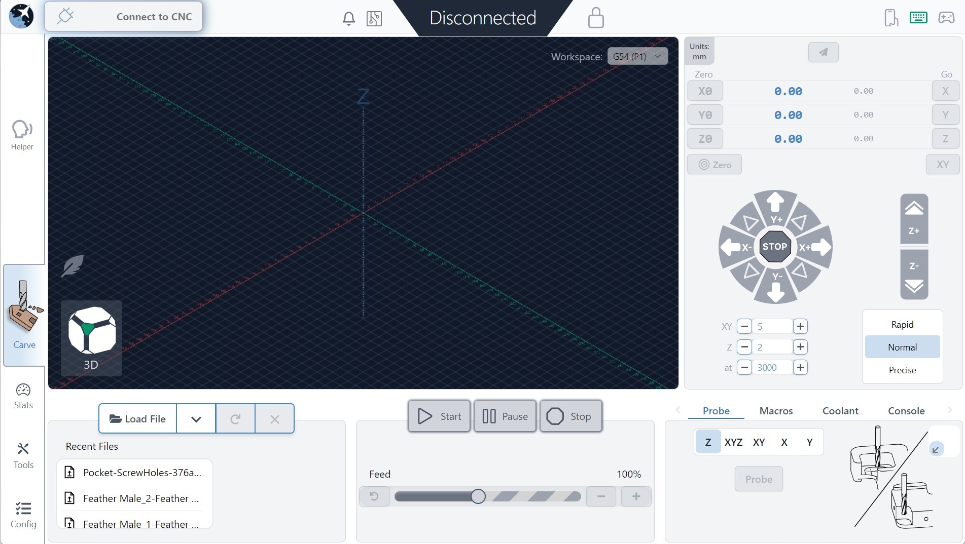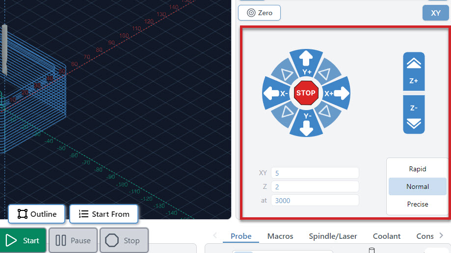 You can choose the amount that the machine will move in the XY directions by changing the “XY move”, the amount in the Z direction with “Z move”, and the feed rate / speed of movement with “Speed.” gSender has defaults for large, medium, and small movements that you can switch between by pressing the “Rapid”, “Normal”, and “Precise” buttons.