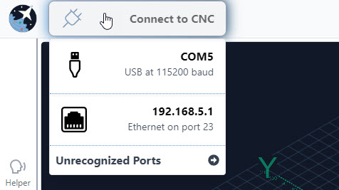 Once that is done, hover over the Connect to CNC button at the top left corner of the screen and click the first option. Sometimes there’s more than one port available, so you can either unplug the other items you have plugged in, or you can try connecting to each one to see which one is your LongMill (note that it’s recommended to connect this way on your first setup even if you’re planning to use Ethernet in the long-run).