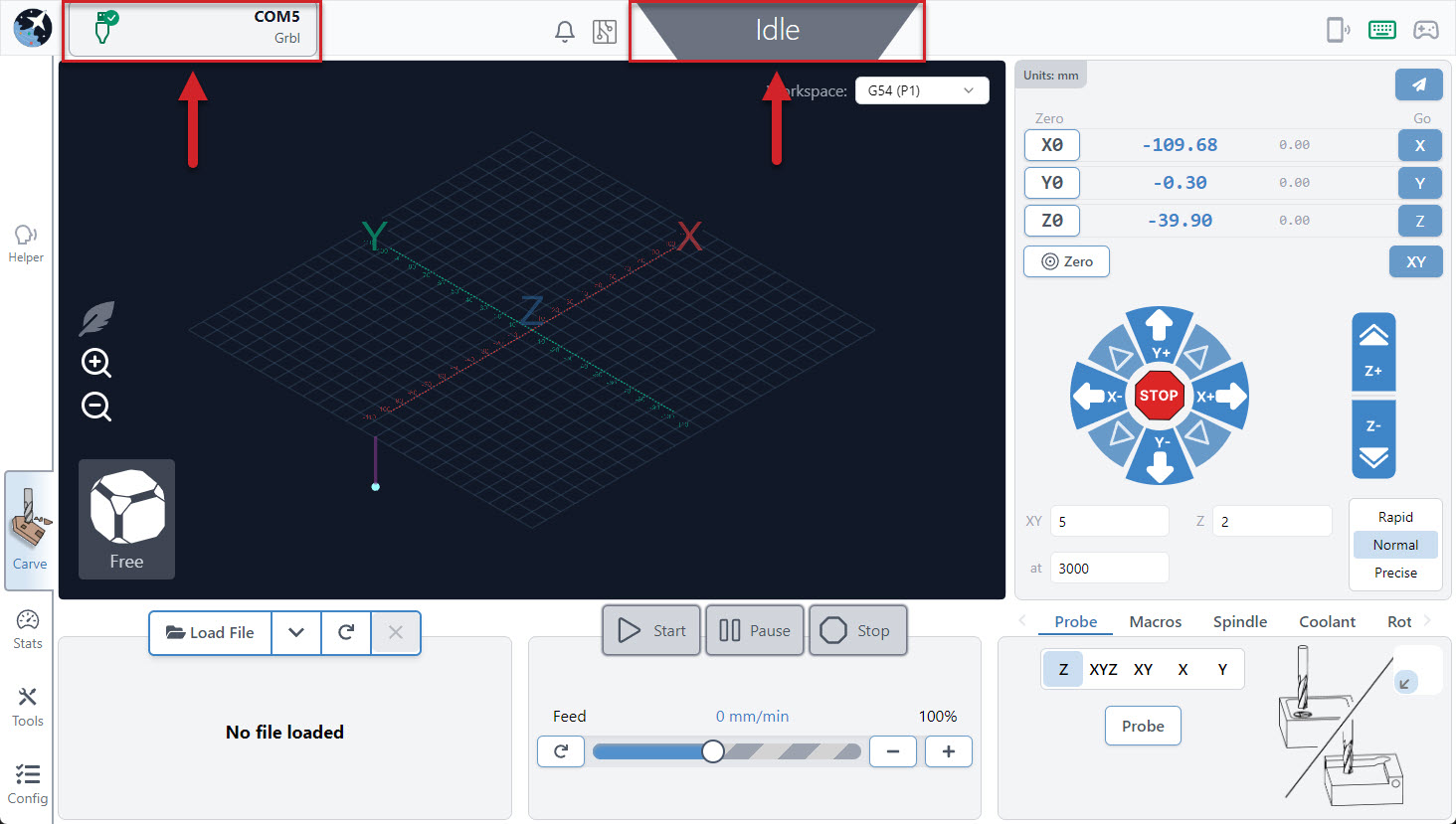 Once you’ve selected the port, your machine should be connected. If your machine is powered on, you will usually hear a gentle hiss and a thump noise when the machine connects which is a nice audible confirmation. If you don’t hear that sound, make sure you have released the E-stop so power is going to your machine – indicated by and orange power light on your control box.