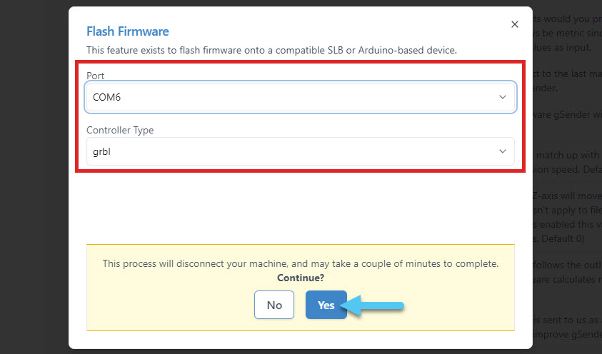 Select your current Port and keep the controller type as “grbl”. When ready, click the ‘Yes’ button to flash the latest firmware.