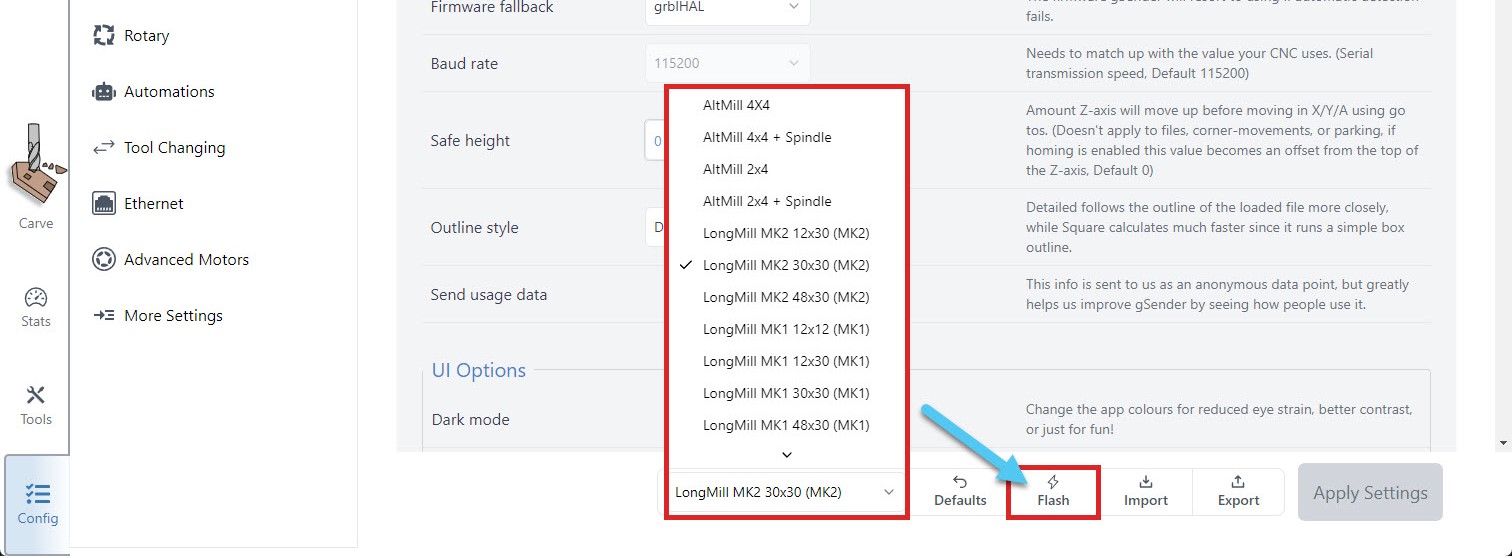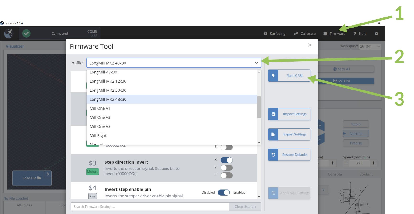 - Using gSender – this is the easiest method since gSender will always contain the most up-to-date LongMill firmware and it also performs the entire process automatically
