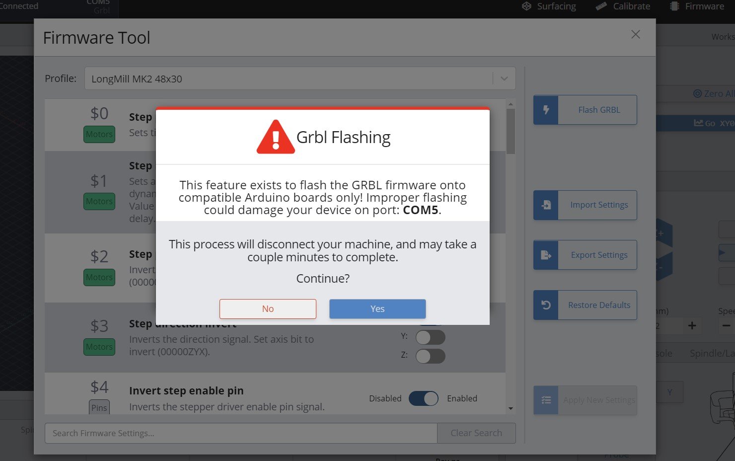 You will see a warning about the risk of flashing the firmware. If you own a LongMill and have not made any modifications to your control board, there is almost no risk in completing this process. Press ‘Yes’ to continue.