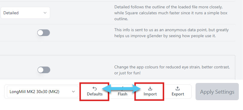 If you previously exported your own custom settings, you can instead click the ‘Import Settings’ button to load your original settings back onto your machine. Close the Firmware Tool window, and try jogging to ensure the machine is working properly.