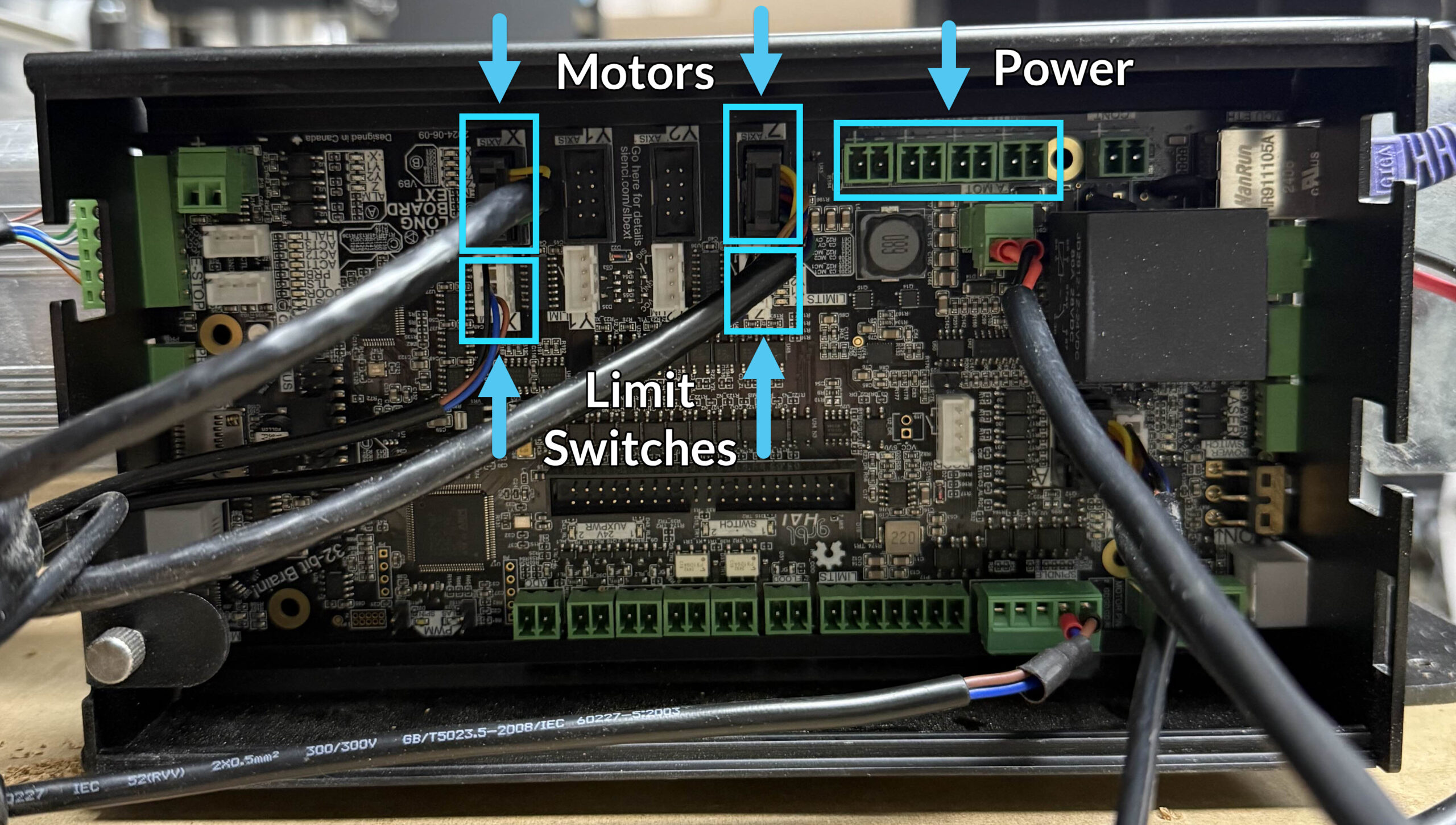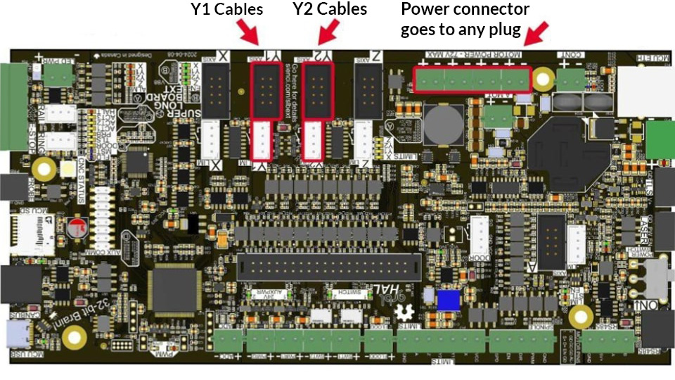 Plug the two-pronged motor power connectors into the left most power ports. The power ports all supply the same output and therefore the connectors are able to be plugged into any, however, for installation purposes we recommend you to plug into the two leftmost ports while installing X and Z.