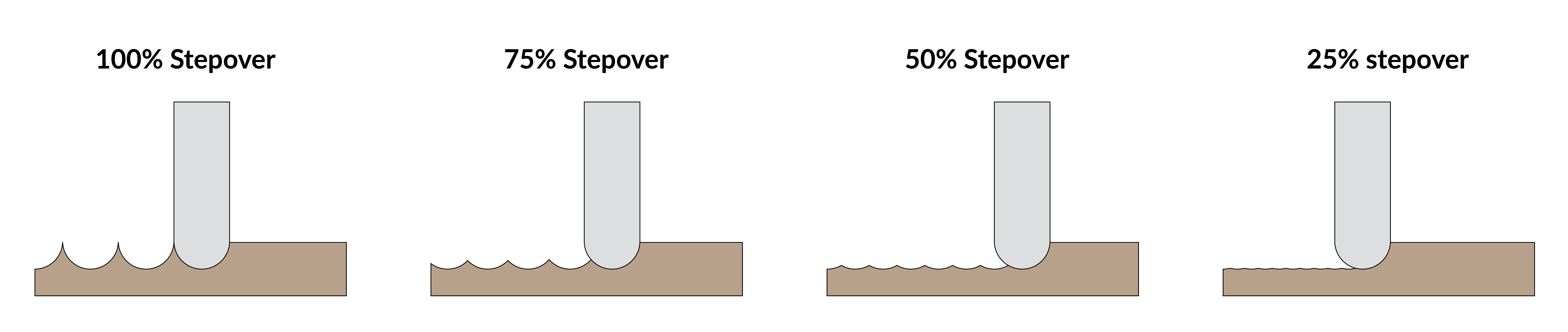 When a ball end mill carves in several straight, parallel passes it leaves behind small amounts of material in the form of ridges – these are known as ‘cusps’. These cusps are the reason for the increase in detail/resolution with a lower stepover; as shown in the photo below, a larger stepover means larger cusps, while a smaller stepover means the cusps continue getting smaller until they’re imperceptible to the human eye. Obviously, with lower stepover, this means a greater number of passes, and a much longer total project time. You’ll need to decide how much detail you need, and how long you’re willing to run the project for. For example, for carving a 2″x2″ relief, you’ll probably want to use a low stepover amount such as 5-8% since this project won’t take more than an hour. If you we’re carving something much larger, you might want to set your stepover much larger and forego finer detail for a faster overall project time.
