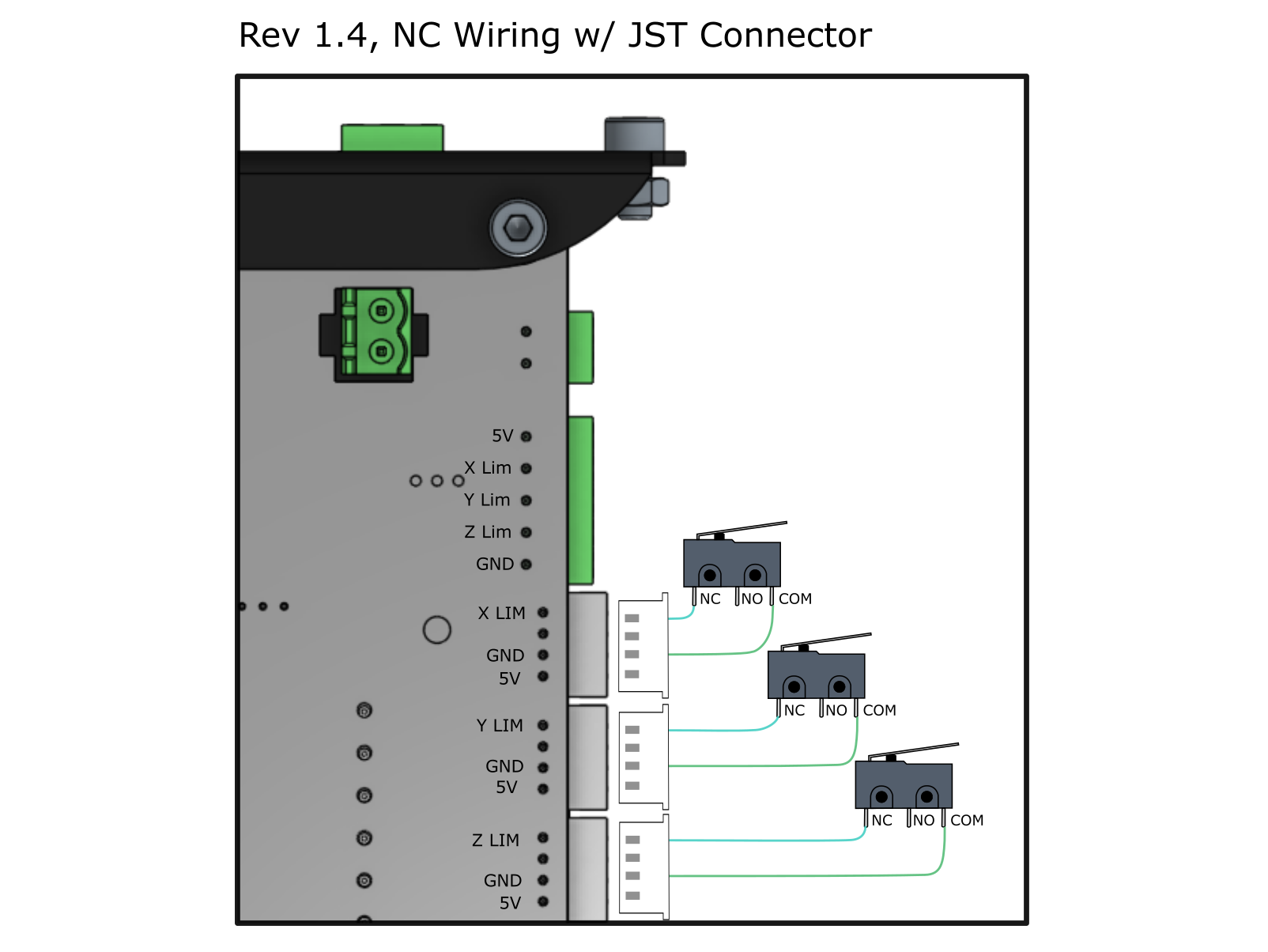 For switches that come with 4-pin JST connectors, you can simply plug the switches into the white connectors on the side of your control board, making sure the wiring is correct based on the type of switch you have (NO, NC, NPN, PNP). If the wiring order is wrong it’s also possible to use a small flathead screwdriver to press into the pin slots on the underside of the connector to remove the crimped pins and reorder them.