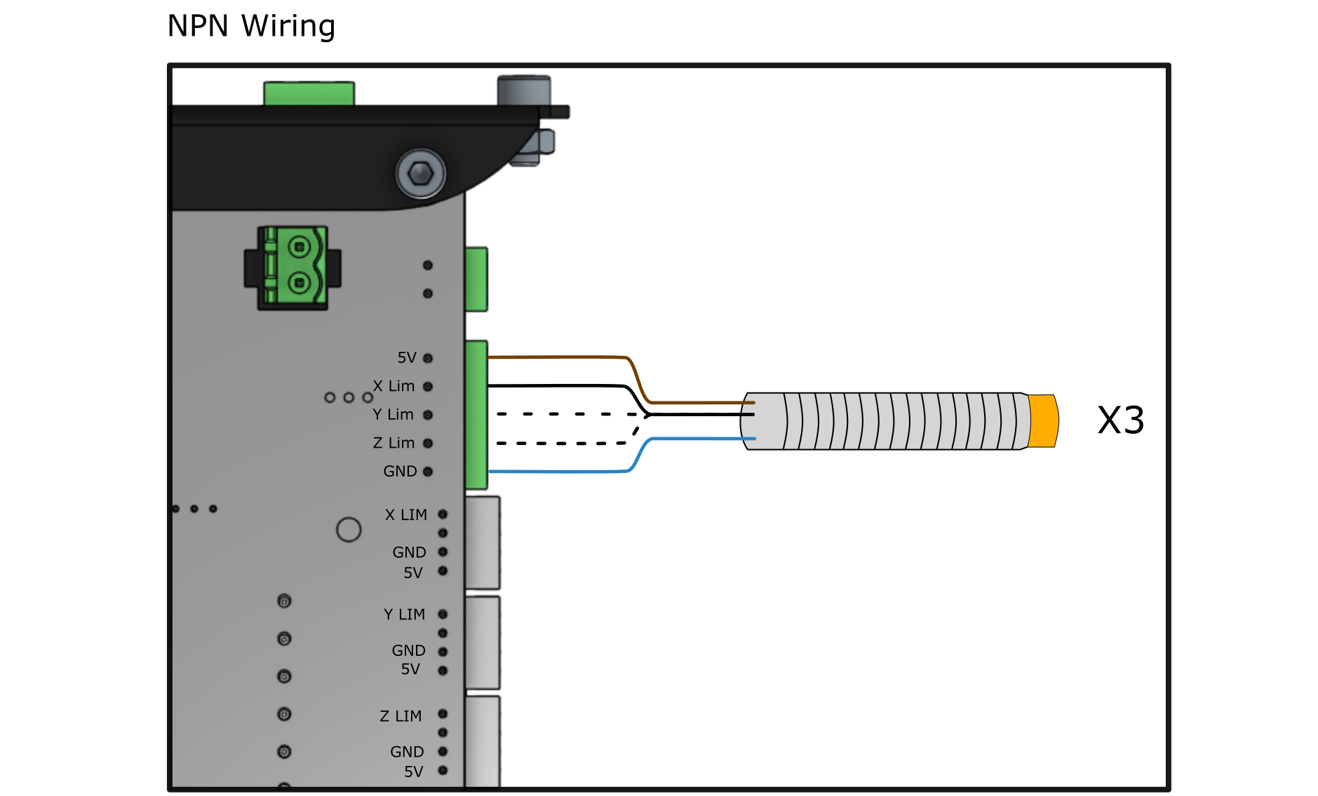 If you have just the switch and wires, use the green screw terminal connector to securely connect each wire. For mechanical switches (NO, NC type), each switch must be wired to a different signal line, then to GND, as indicated in the “x3” label on the diagram. For inductive sensors (NPN, PNP type), each switch must be wired to a different signal line, then to GND and 5V, as indicated in the “x3” label on the diagram.