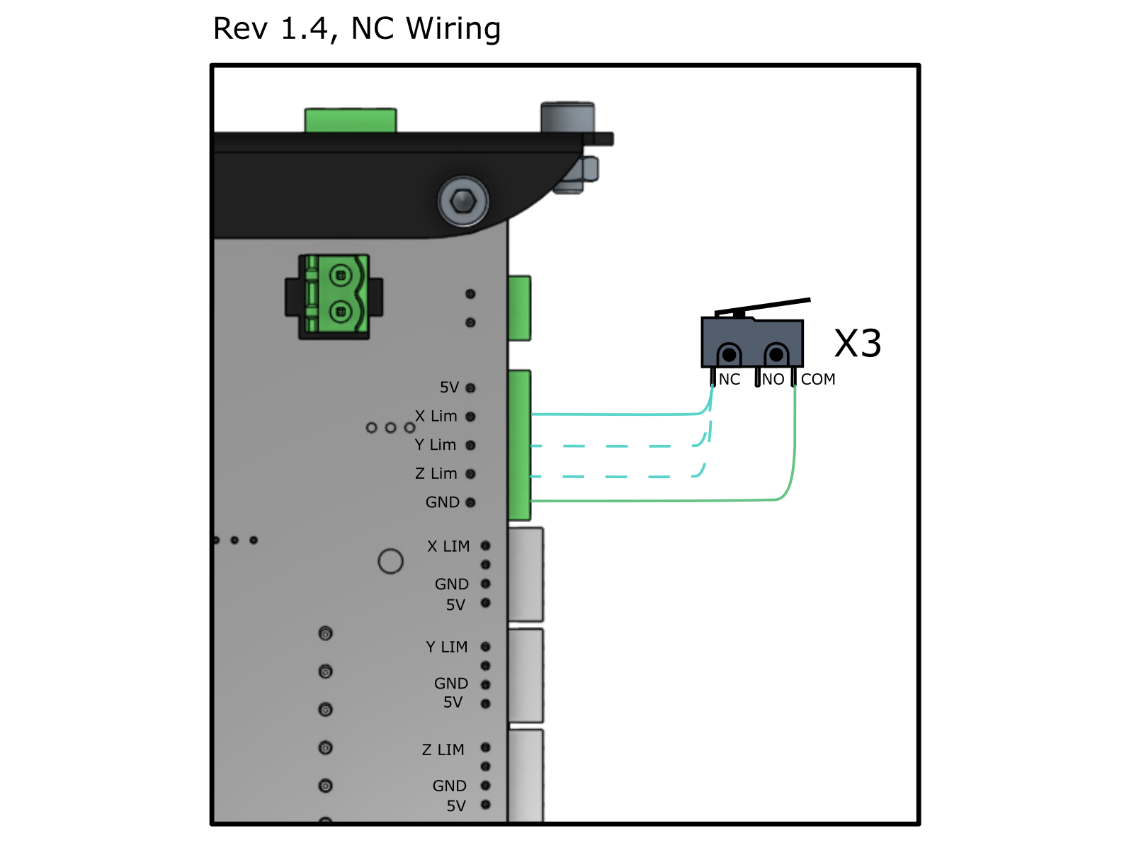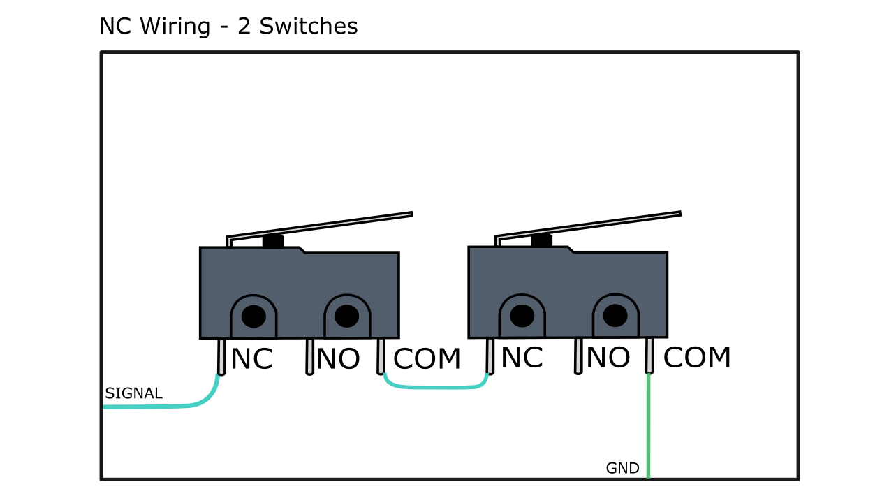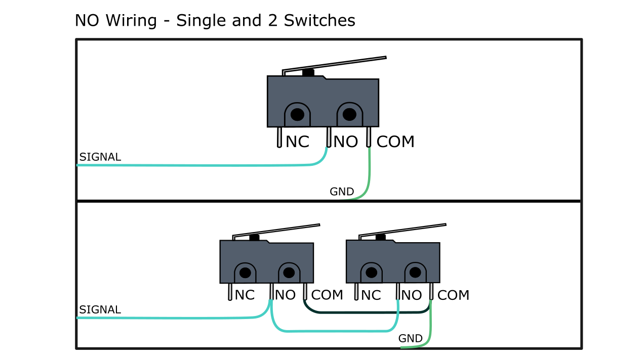 If you’re using two switches per axis to act as hard limits on each end, wiring them together will differ whether they’re being set up as NO or NC.You can see how an NO type switch is wired individually and in parallel with another NO switch so if either switch is triggered a signal will be sent to the controller. The two NC switches are shown wired in series so if either switch is triggered it causes the circuit to break and alert the controller.