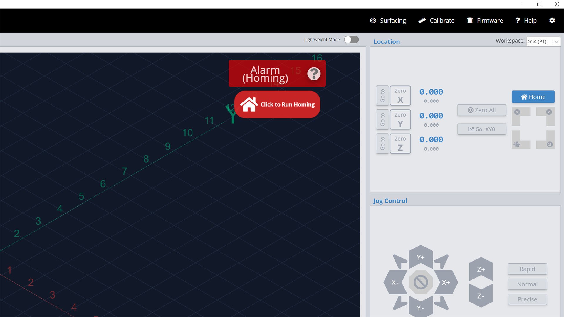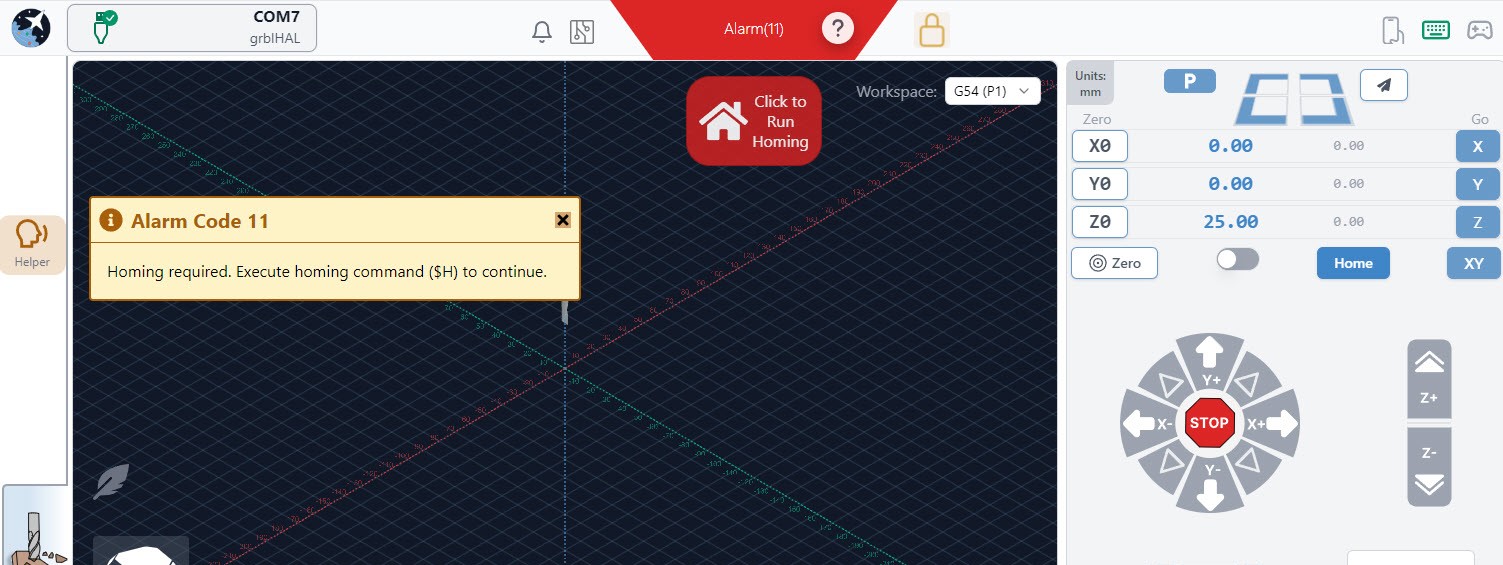 If you’ve enabled homing and lost a connection to your machine it will enter an alarm state upon re-connecting. To get out of this alarm state, the machine must be homed so it can rediscover its location. When homing your machine for the first time, be ready to press the E-stop in case any sensor fails to trigger. Once homing is complete, you can check that the machine coordinate values (gray numbers below the blue ones in gSender) are all set to zero or thereabouts.